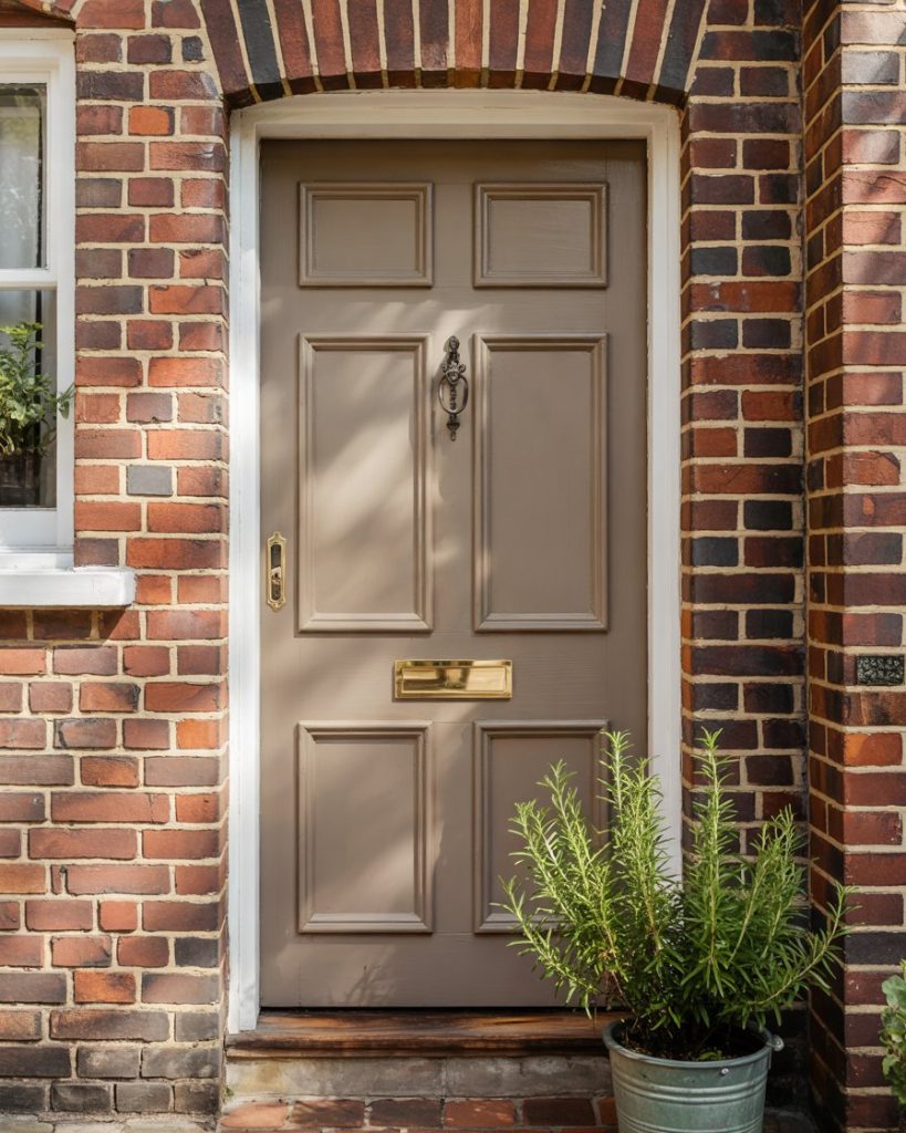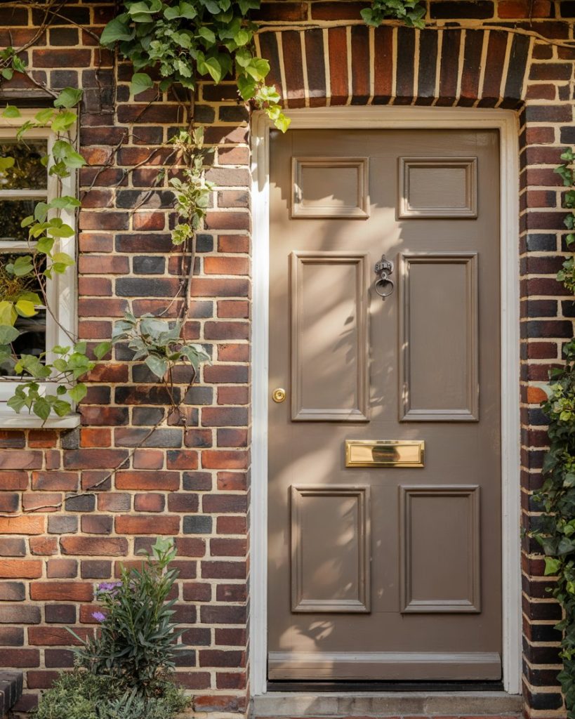 A brick house painted with warm taupe has an understated elegance. Taupe is a perfect blend of gray and beige. It also softens the natural red tones of the brick. Color experts say that this calm neutral is set to take over the exteriors for 2026, and for a good reason—it is timeless and elegant.
