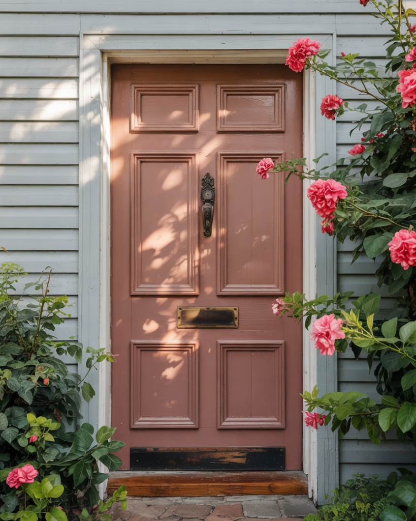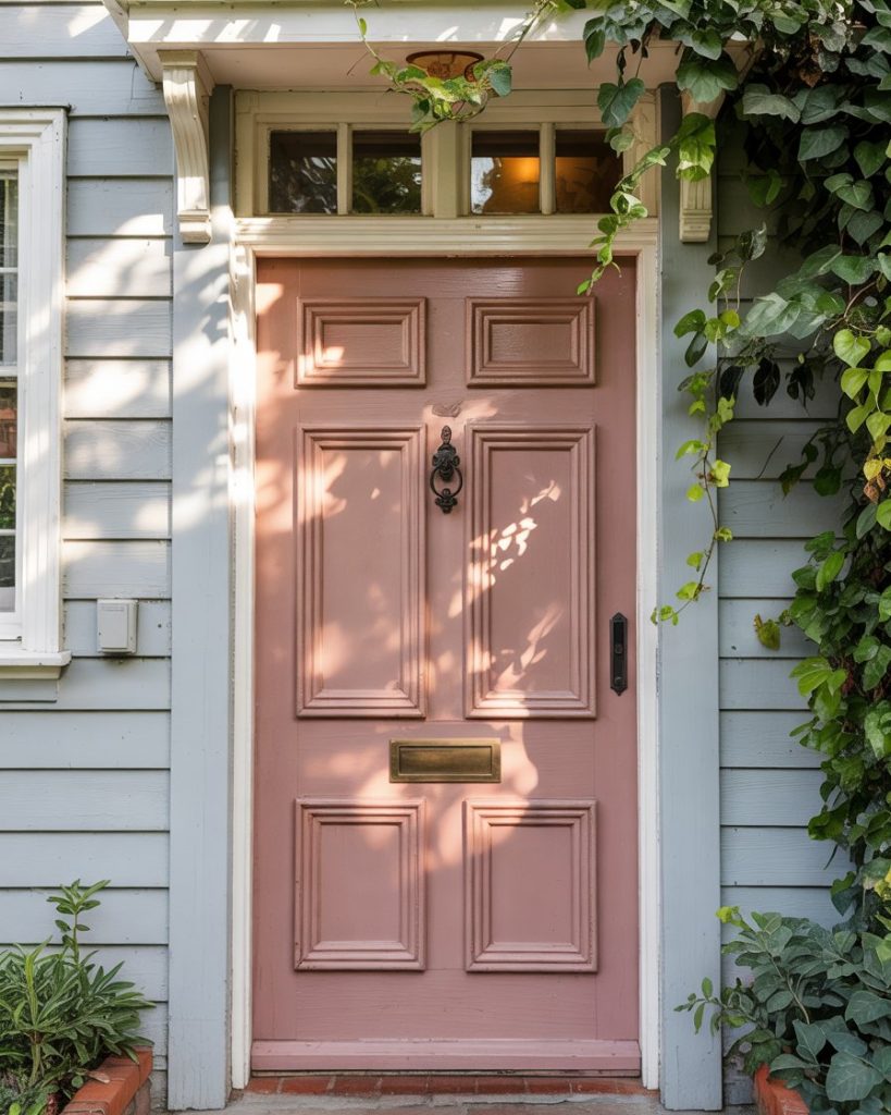 A light blue house with a dusty rose front door is romantic and vintage. The combination gives a cheerful and welcoming look to the entrance. The rosy undertones to the palette will be dominant in 2026 as homeowners are leaning toward more softly comforting hues.