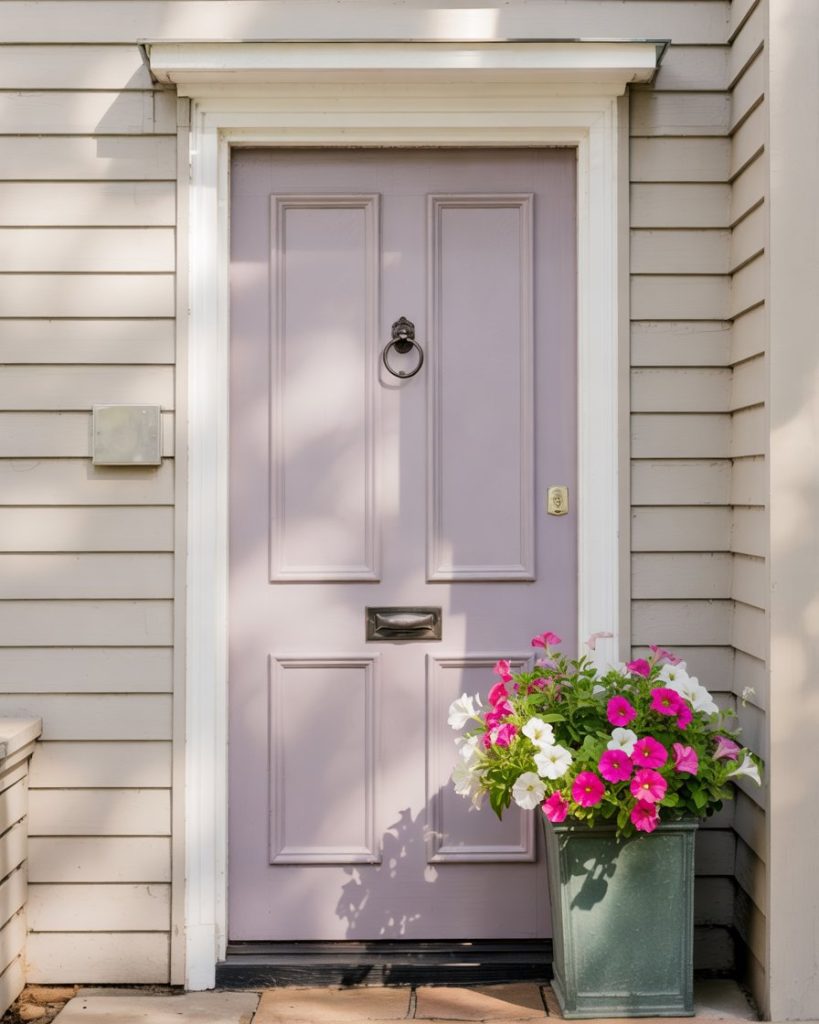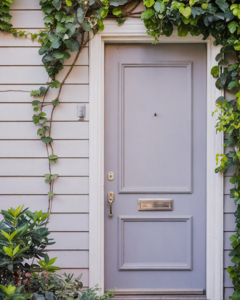 A soft lavender front door creates a striking contrast with a grey house. This soft shade is unexpected yet elegant in its simplicity, providing subtle color to modern architecture without detracting from it. Lavender is called “the new neutral with personality” for 2026.
