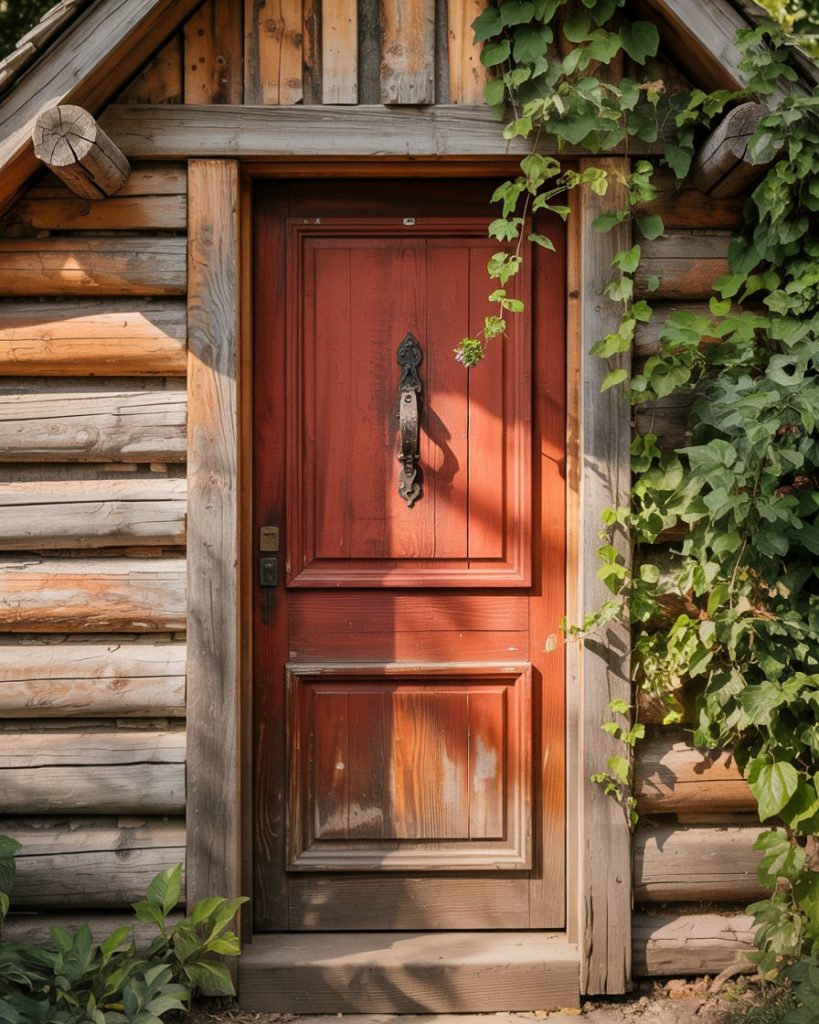 A cozy log cabin deserves a rustic red front door to make a bold yet welcoming statement.