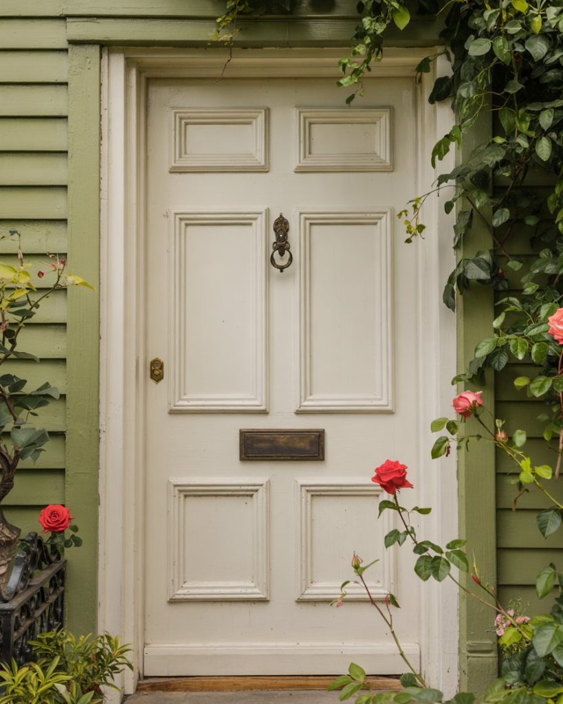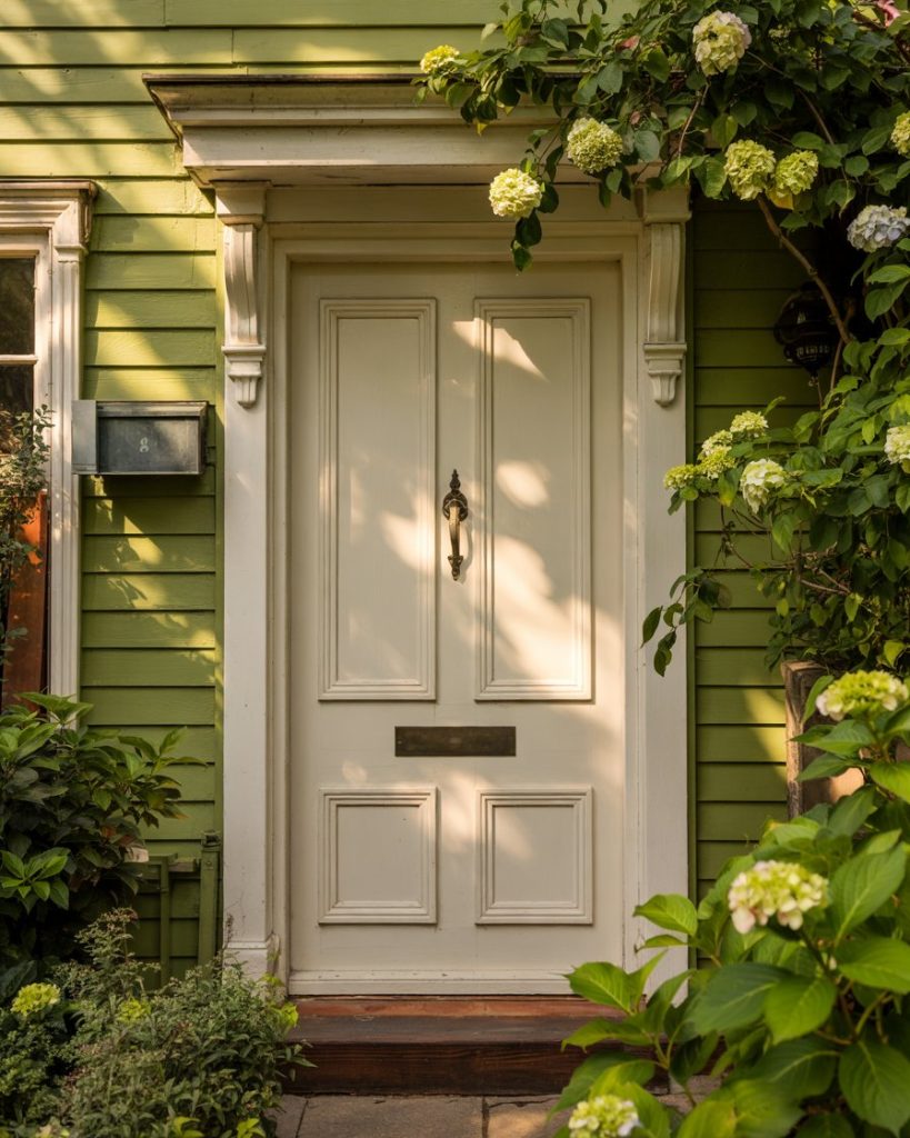 There is a greenhouse with a green and creamy white front door. The neutral creamy white facade offers a pleasing counterpoint to the green, while the earthy green provides understated elegance. It’s predicted that this earthy green and creamy white combination will still be popular in 2026.