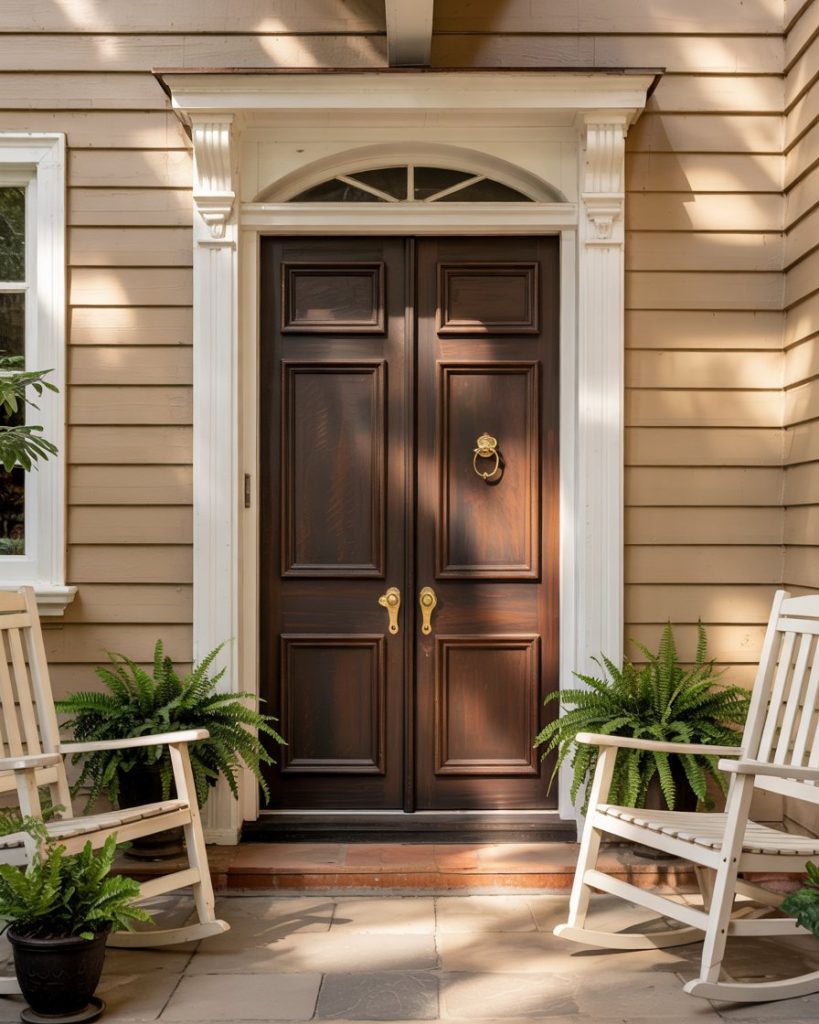 For a tan house, an espresso brown door adds richness and contrast. This dark, coffee-inspired tone brings warmth and depth, working beautifully with lighter siding. It’s a classic option that remains stylish year after year—perfect for homeowners seeking understated elegance in 2026.