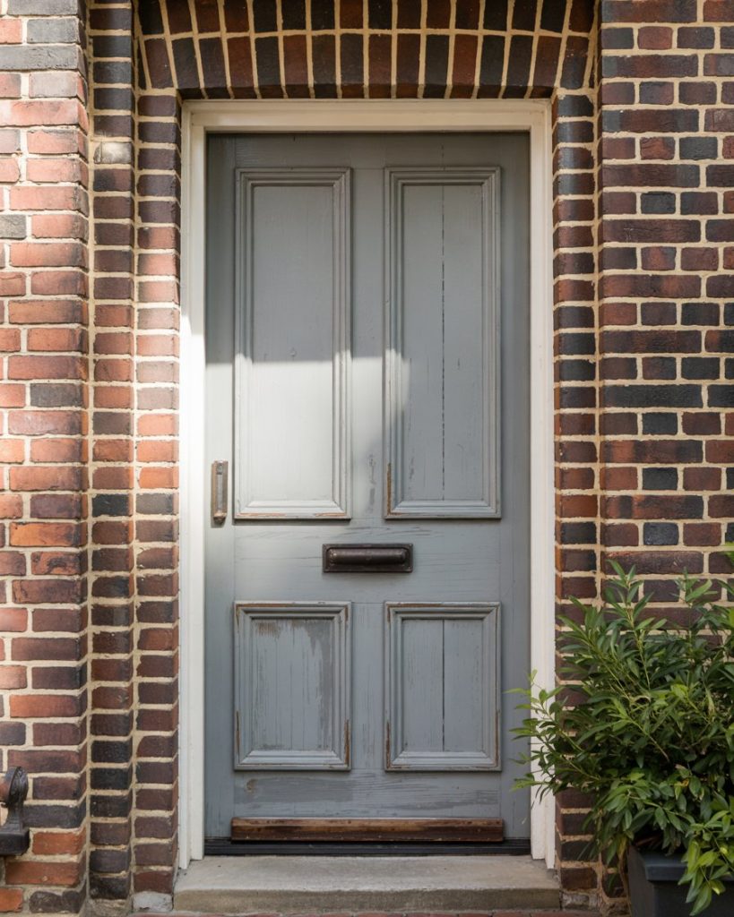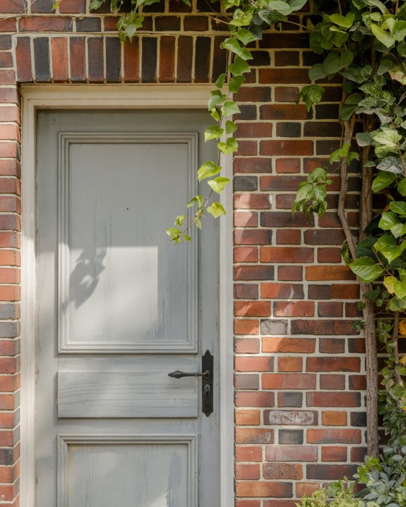 When your home features both a garage and a brick house design, a weathered gray front door unifies the look while adding texture. This color feels vintage and contemporary at once, blending seamlessly with natural brick and metal garage doors. It’s a versatile, trend-forward option for 2026 that suits modern suburban homes.
