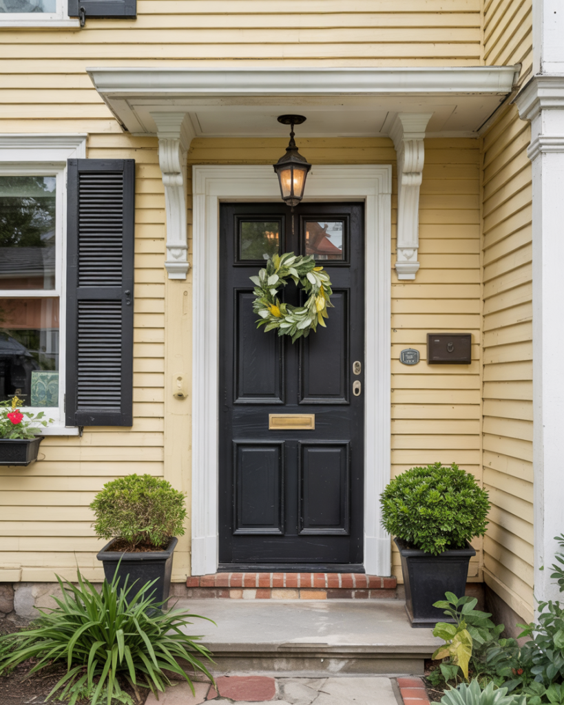 A yellow house paired with a charcoal black front door delivers balance and distinction. Black tones continue to trend for 2026, especially when softened with gray undertones for a more natural appearance. This combination grounds the sunny façade, giving it a refined and elegant touch that looks stunning in any season.