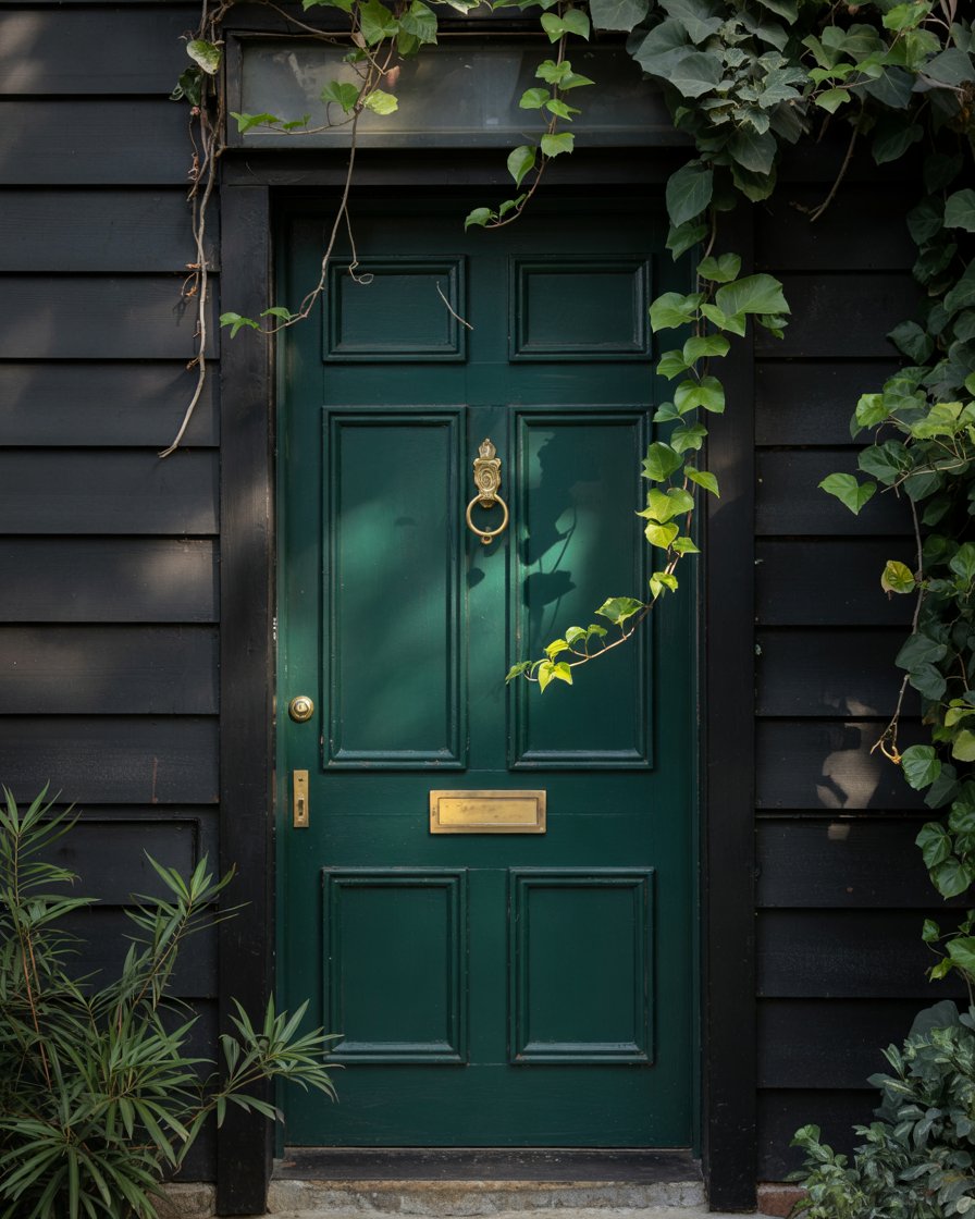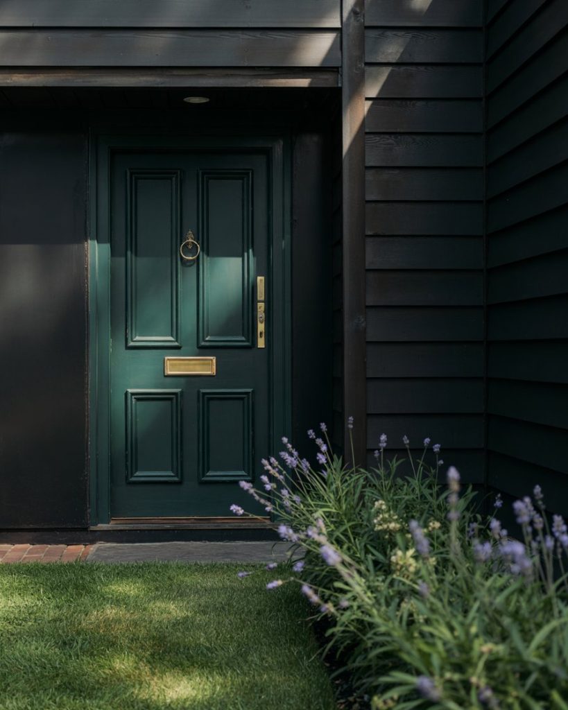A black house or dark charcoal exterior can come alive with a bold emerald green door. Jewel tones are forecast to rise in 2026, offering richness and individuality. Emerald adds vibrancy without clashing, giving dark exteriors a luxurious personality and depth that feels fresh and inviting.