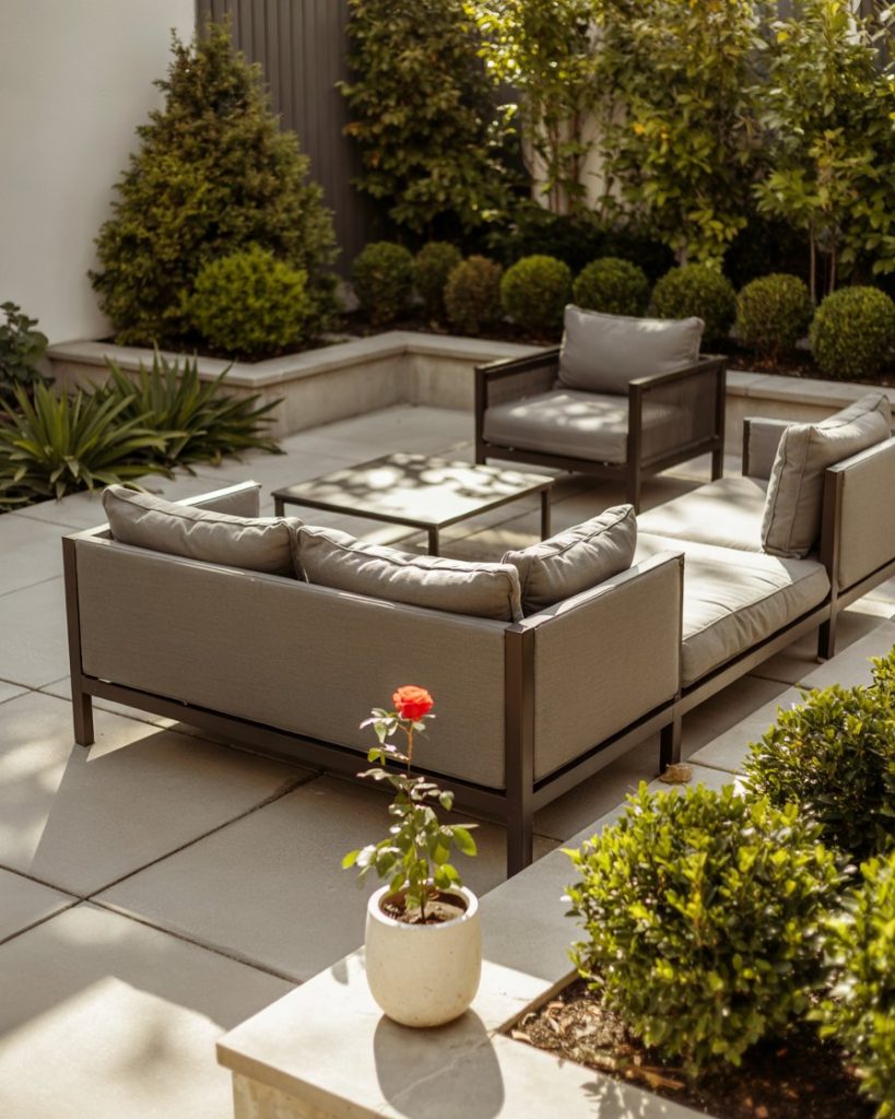 A French courtyard uses symmetry, clipped hedges, and iron café chairs to turn even a small courtyard into a romantic escape. Climbing roses soften the formality, while potted lemons add scent and charm. Homeowners love this idea for its balance: controlled shapes, loose flowers, and always a focal fountain or urn. It’s ideal for those who want order without losing soul.