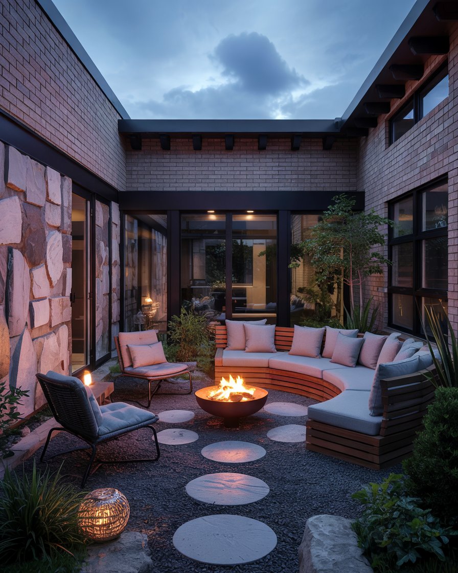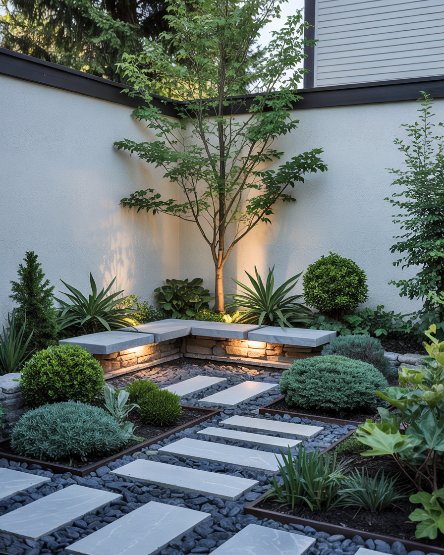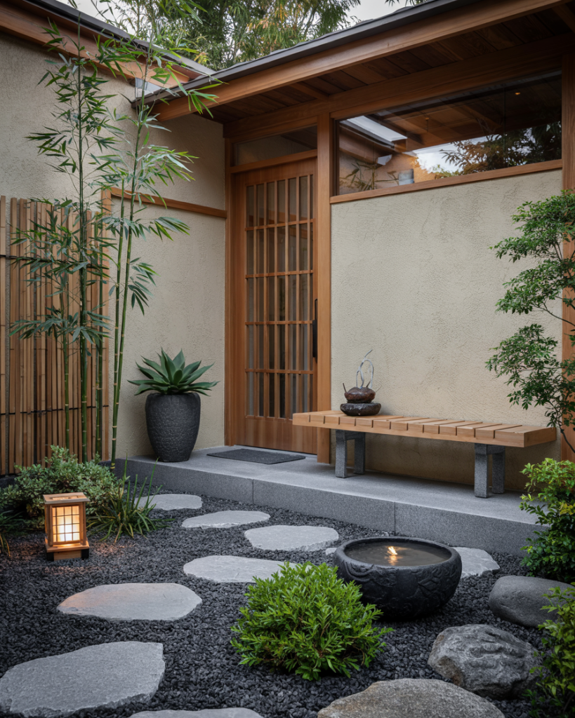 Rooted in Japanese tradition, this courtyard design uses gravel, evergreen shrubs, and soft water sounds to create a meditative feel outside the home. A small stone lantern, raked sand, and a potted succulent replace heavy décor. The goal is stillness, not display, which is why many homeowners choose this layout for morning tea or quiet reading. Influential plantsmen like Piet Oudolf remind us that simple structure can calm the mind all year long.