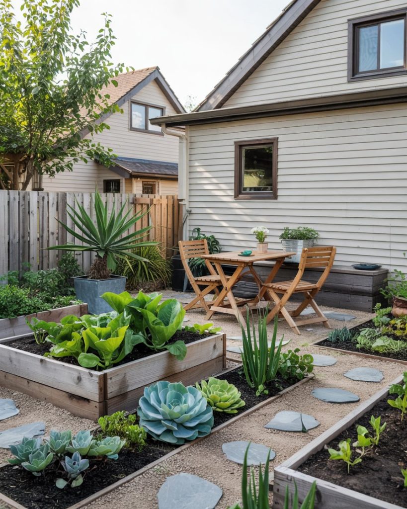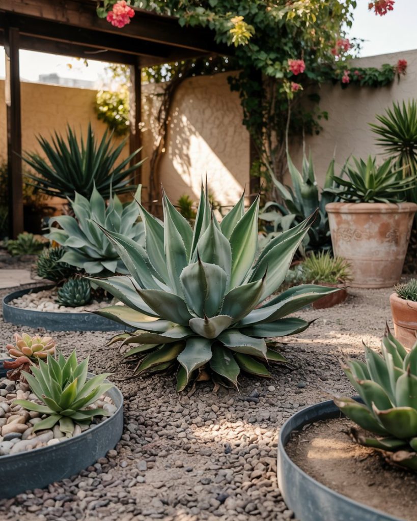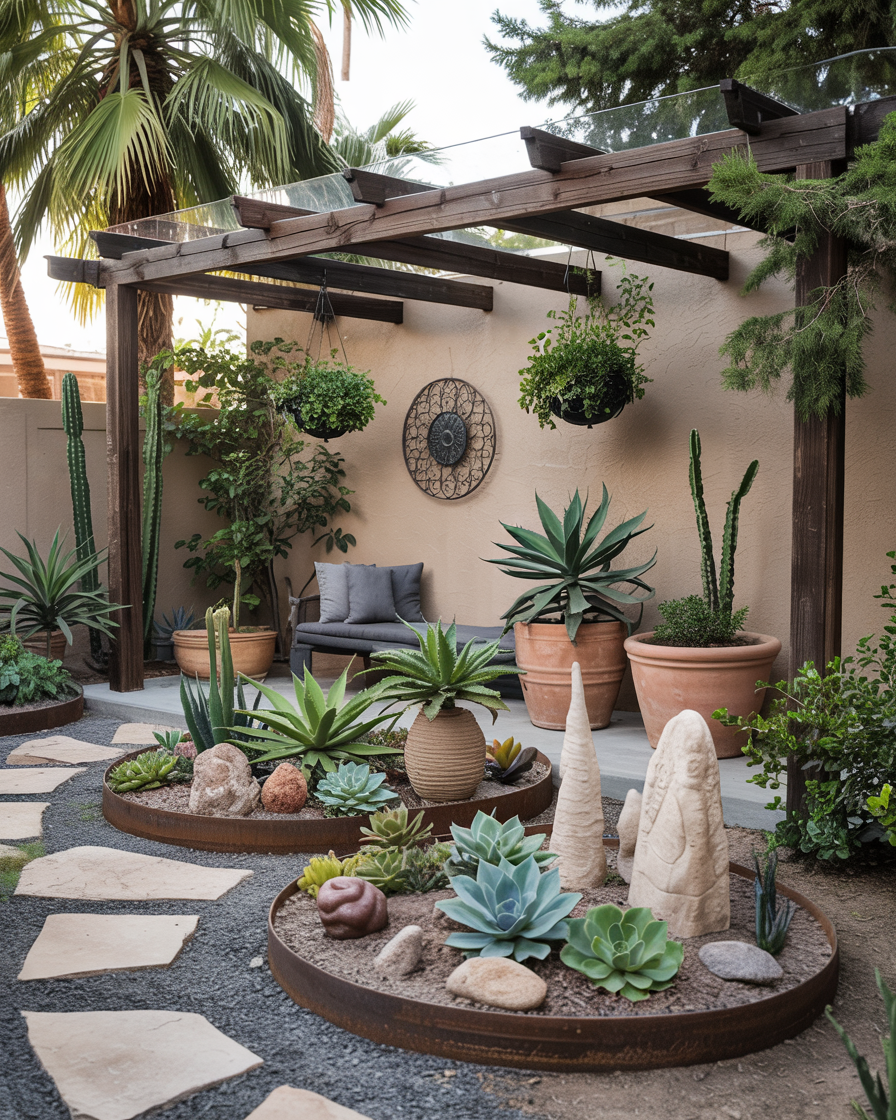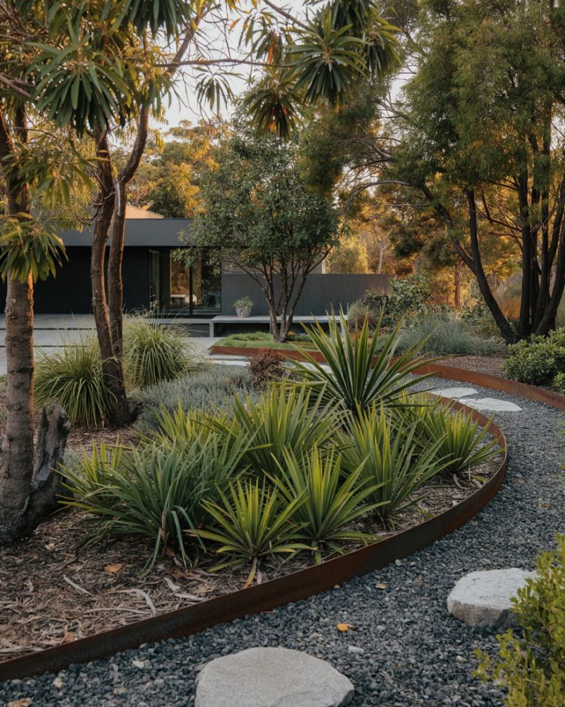 Inspired by Australian and Southwestern landscapes, this idea highlights bold succulent forms, gravel beds, and rust-colored steel edging. Heat-loving plants like agave and aloe create architectural drama with almost no watering. A shaded pergola softens the sun, while clay pots and sand tones keep the layout earthy. This is the opposite of a thirsty lawn—and exactly what 2026 sustainability demands.
