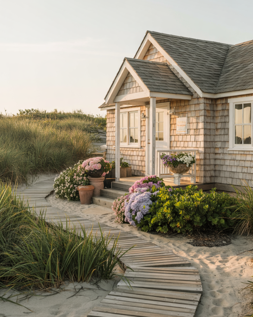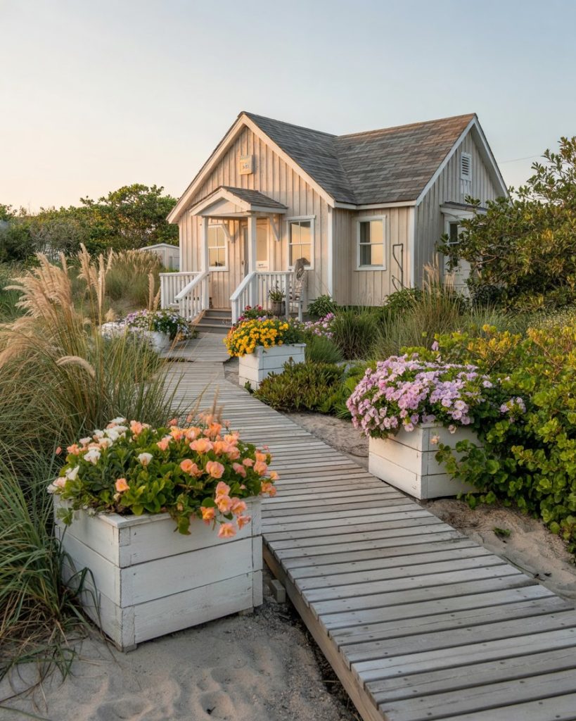 Perfect for beachside home settings, the coastal cottage garden uses dune grasses, driftwood accents, and whitewashed planters along a boardwalk path. Flowers stay soft—blues, whites, and light pinks—and maintenance stays low. Ideal for salt air, windy terraces, or lake cabins. Designers love its breezy charm and barefoot practicality.