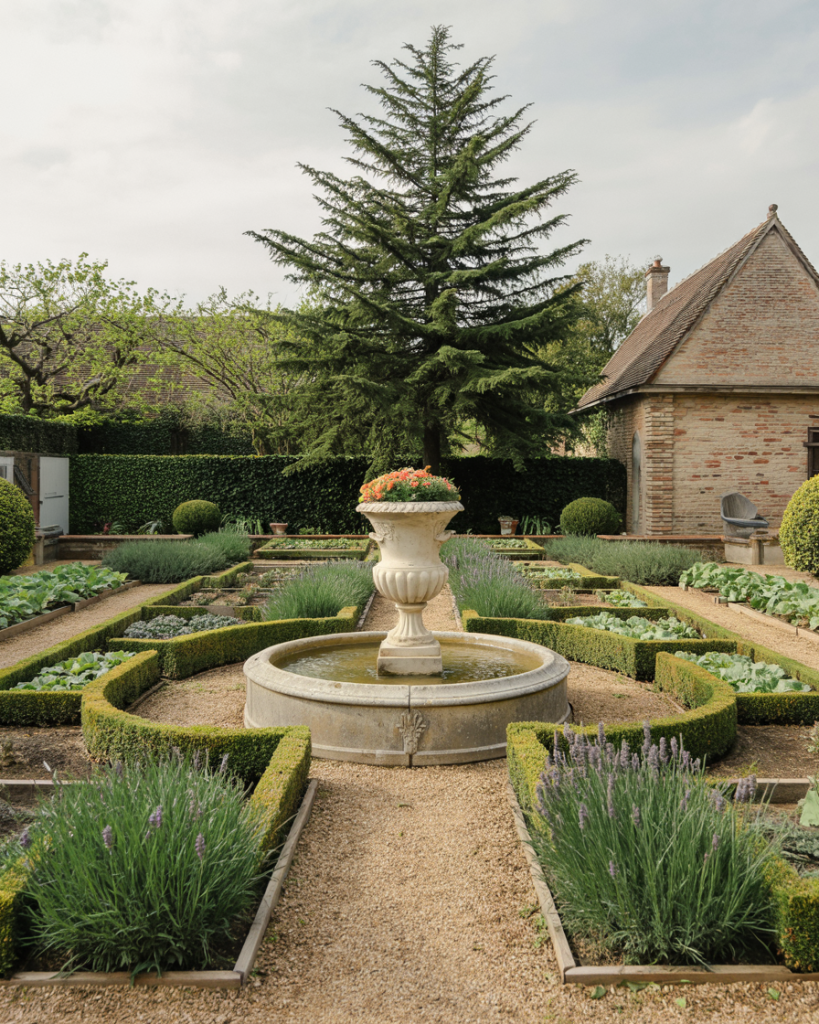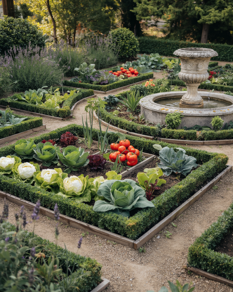 Blending edible planting with formal symmetry, this French parterre turns vegetable beds into art. Boxwood borders outline geometric plots filled with lettuce, peppers, lavender, and marigolds. A gravel path leads to a small urn or birdbath. It’s tidy, fragrant, and productive—royal style meets farmer’s market.