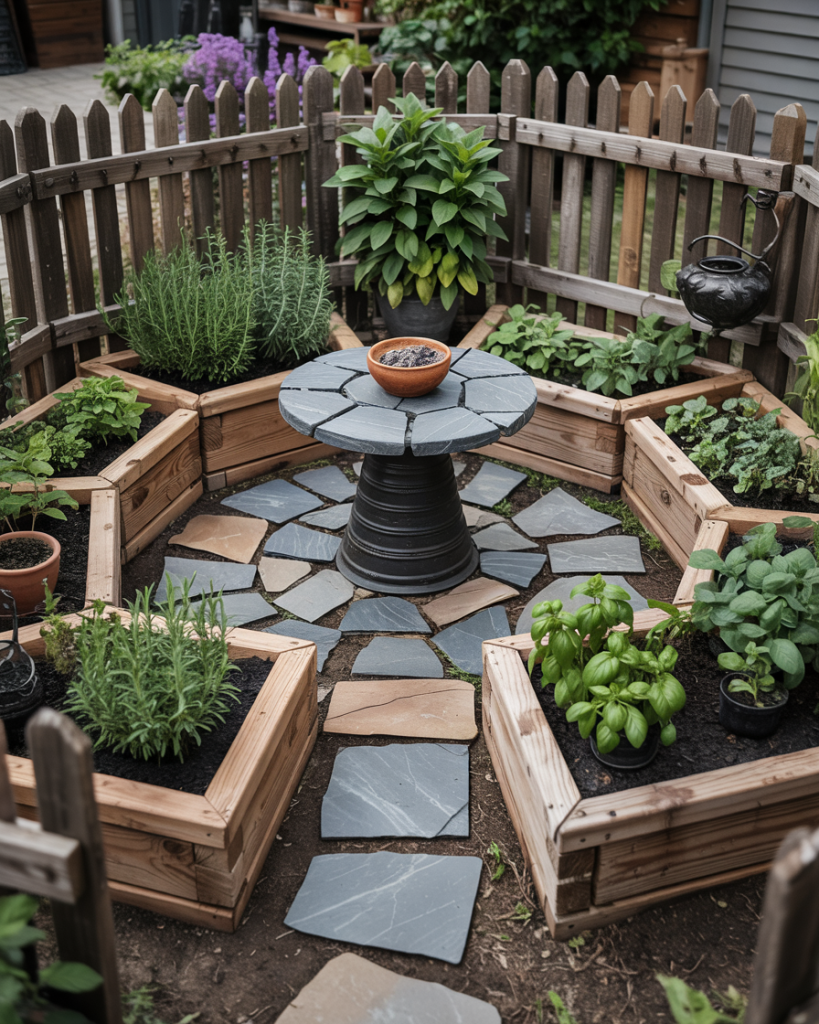A mystical herb garden for tea, tinctures, and spells, blending witch folklore with practical planting. Think sage, mugwort, rosemary, mint, and dark-leaf basil in crescent-shaped beds. A stone mortar table becomes the working altar. This garden works in a tiny space and attracts both bees and curiosity.