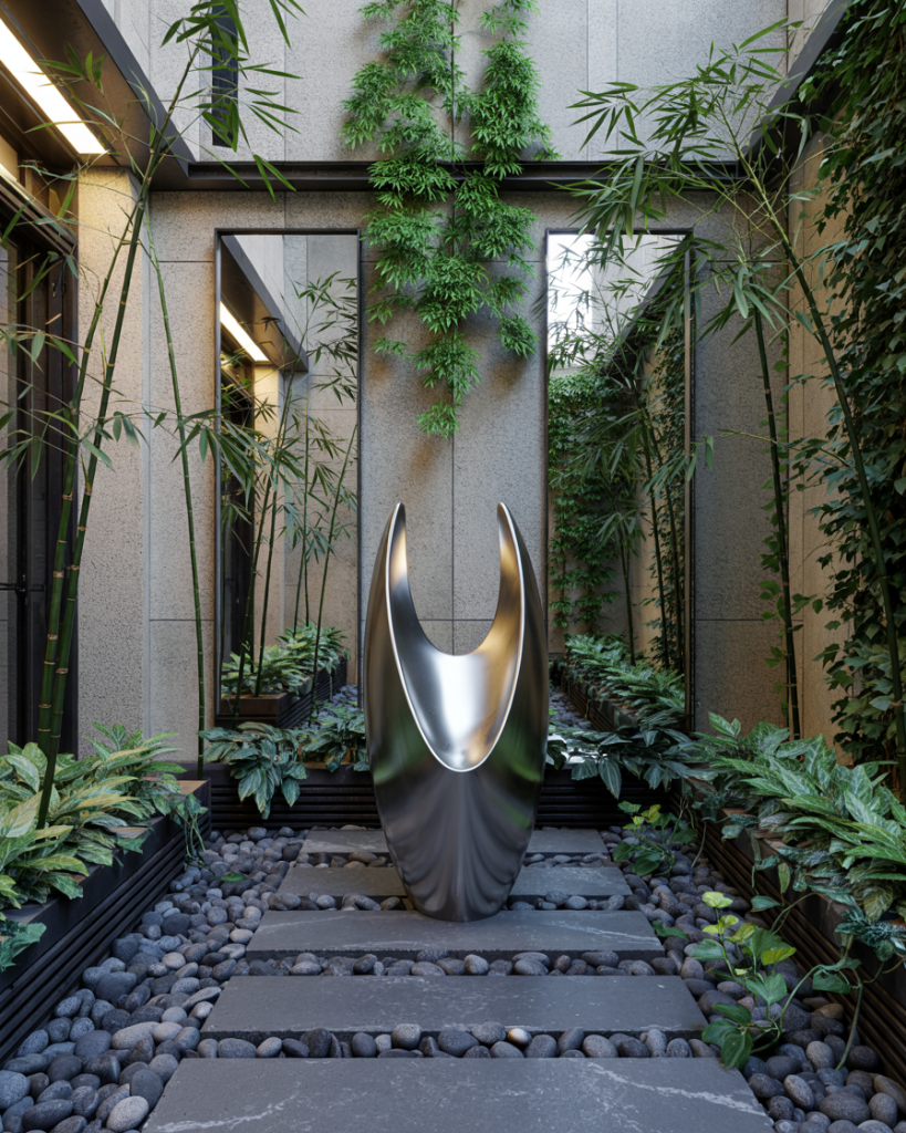 A clever courtyard idea for tight city lots: use large outdoor mirrors to double the visual space, then plant slim bamboo, ivy climbers, and vertical shelving. Neutral paving keeps it clean, and one bold sculpture makes it artful. Best for people who want privacy without losing depth.