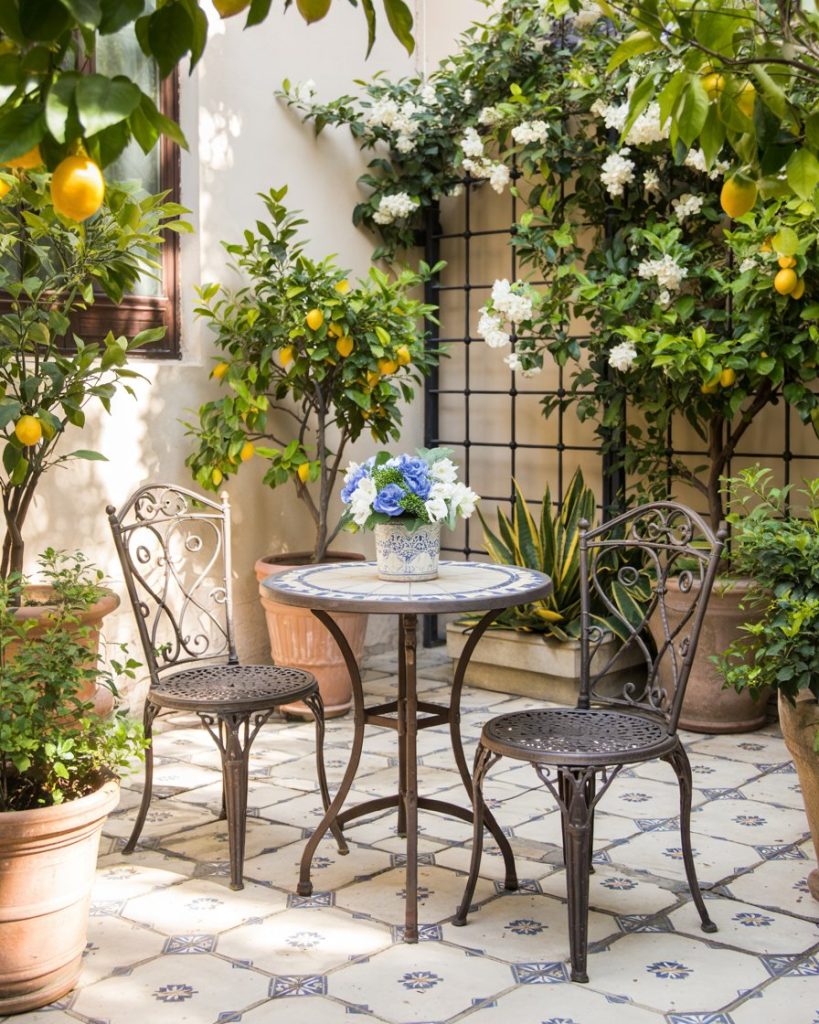 A playful twist on Mediterranean style using patterned tiles, lemon trees, and climbing jasmine around a sunlit patio. Bright blues and terracotta nod to coastal villages, while drought-tolerant shrubs keep upkeep low. Works beautifully on terrace or balcony spaces where color matters more than lawn.