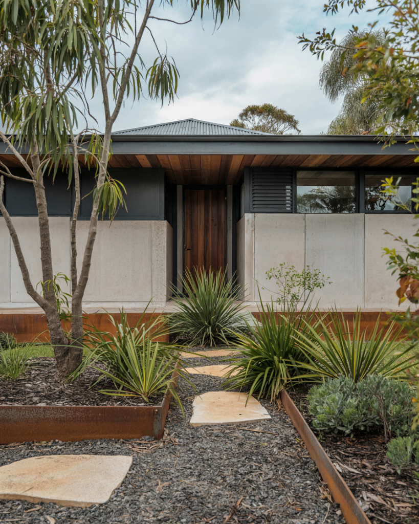 With hotter summers, fire-wise design is rising. This Australian-inspired garden uses fire-retardant plants like lomandra, grevillea, and native flax, plus gravel buffers instead of mulch. It keeps beauty while adding safety—especially useful for homes near woodland edges. A good example of form meeting function.