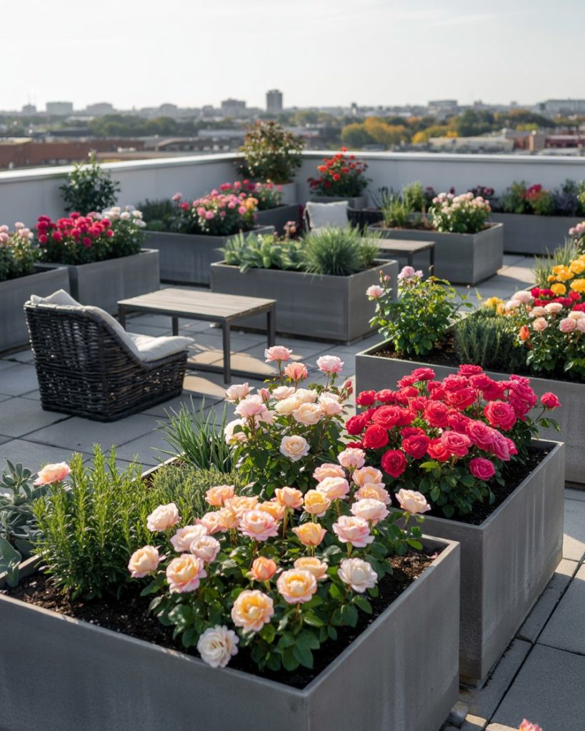 A geometric roof garden that replaces random pots with a square grid of planters holding dwarf rose varieties, herbs, and grasses. The repetition feels modern, but the blooms keep it romantic. Lightweight soil mixes and drip irrigation make it practical even for older buildings.