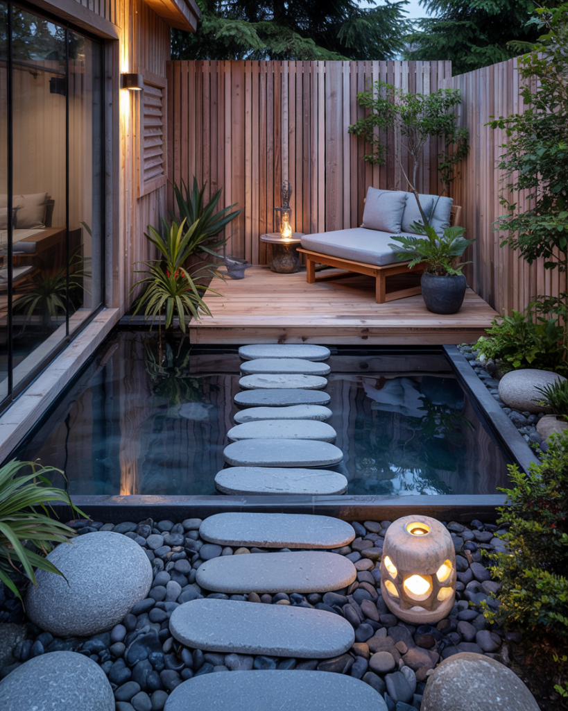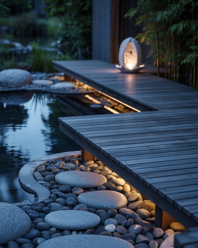 A Zen deck built around a shallow ripple pool where water circles slowly over dark pebbles. Paired with smooth cedar boards, a single stone lantern, and soft under-bench lighting, it turns an outdoor space into a soundscape. Ideal for stress relief and evening reflection.