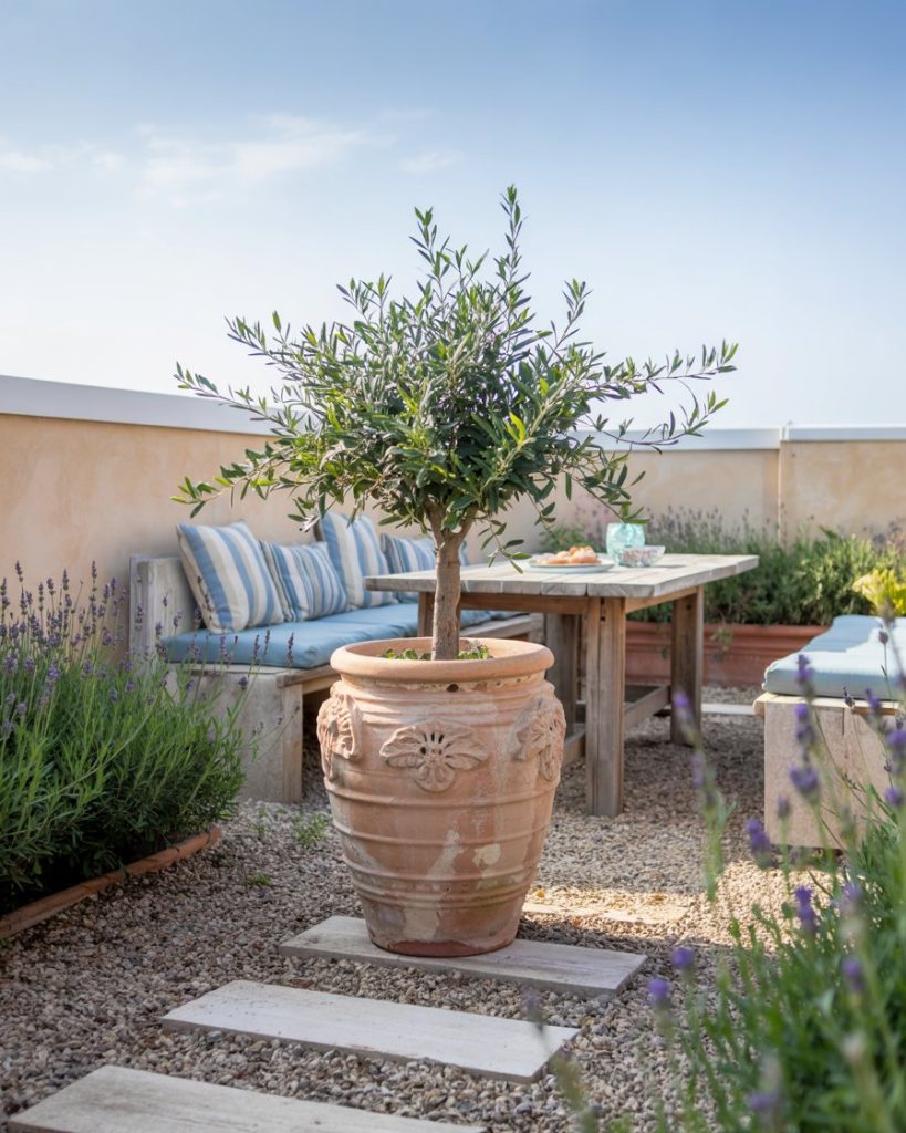 Turning a roof or high terrace into a Mediterranean escape is ideal for hot, dry regions. Olive trees in terracotta pots, lavender, gravel mulch, and blue-striped cushions create instant summer energy. The style thrives on sun, fragrance, and low-water plants, which is why Southern U.S. homes are adopting it fast. It’s practical too: less lawn, fewer weeds, and more space to dine under the sky.