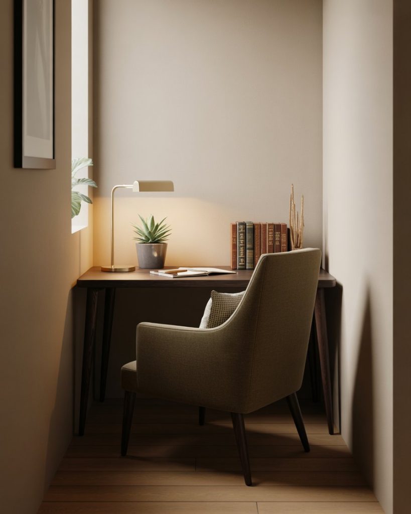 If your long narrow hallway has a quiet corner, turn it into a cute workspace with a slim desk and lamp. Great for upstairs or entrance areas. Add a bohemian wall sconce or minimalist floating shelf to make it productive yet stylish.