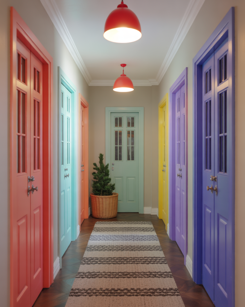 Paint every door a different color for a fun contrast. Dr. Seuss and daycare creativity inspired, the school-like twist is great fun. For the grown-ups, opt for muted pastels for a chic boho pop that’ll brighten any long or wide hallway.