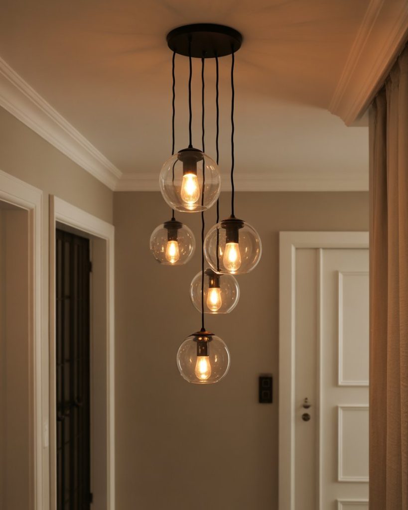 Group pendant lights at various heights for a sense of movement and visual rhythm. Ideal for extended or broad halls and stair landings. Mix glass globes for minimalist undertones or brass finishes for vintage eclectic warmth.