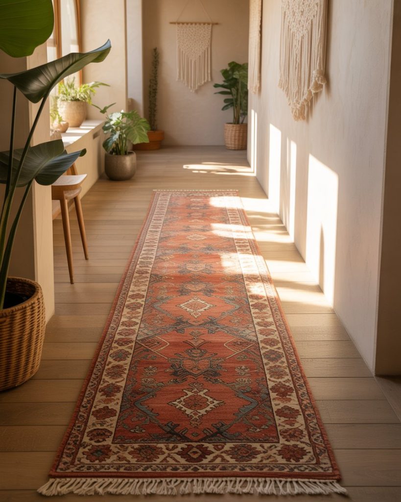 A patterned runner welcomes the narrow hall to immediately bring vibrance. Go bohemian with tribal prints, or very dark vintage florals. With a wide hall, a large rug grounds the space. Runners are soft underfoot; they protect the flooring and visually stretch long corridors into inviting paths.