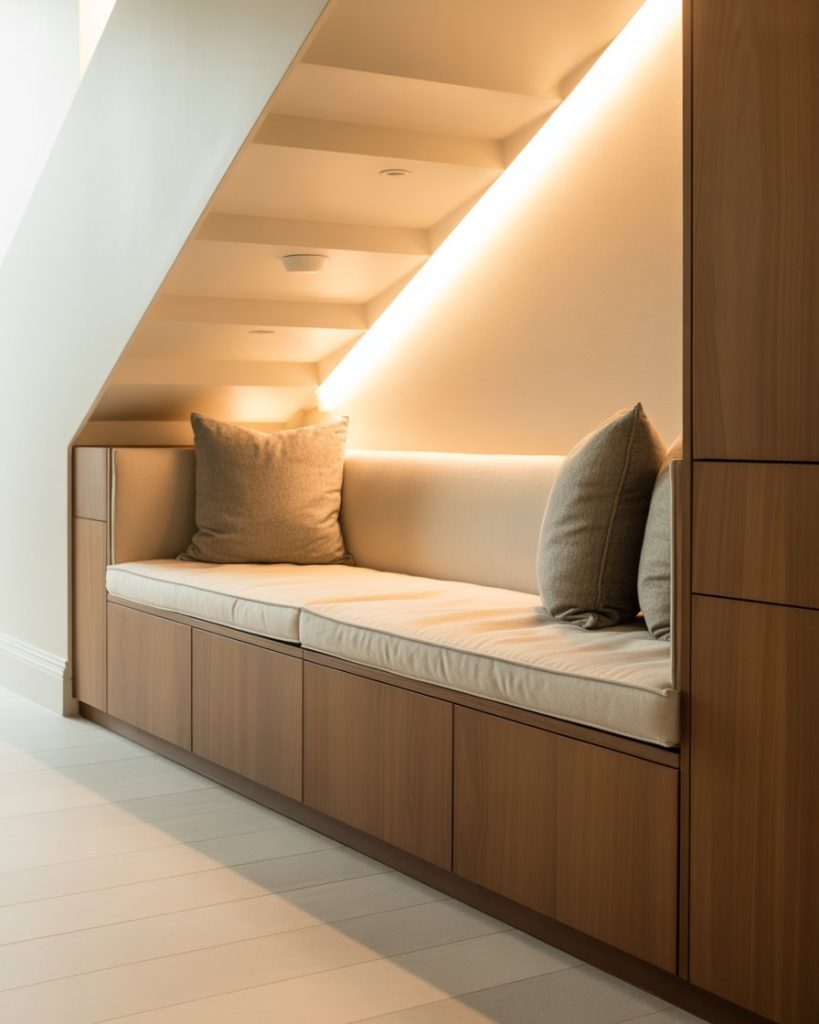 A built-in bench underneath the stair or along the entrance wall makes your hallway functional and pleasant. Go cushioned for the cute or boho vibes, or go minimalist with leather or linen. It is a good idea for generous or upstairs places where comfort meets organization.