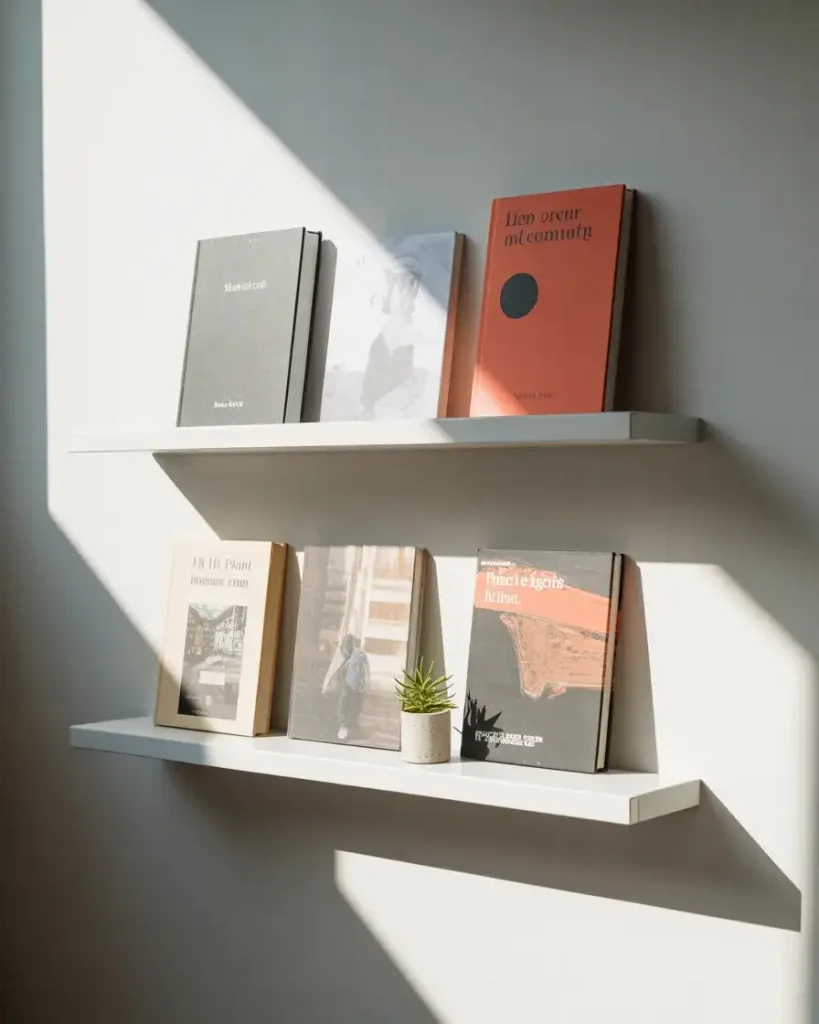 Sleek floating shelves in light wood or matte black offer a clean, contemporary alternative to bulky bookcases. This modern approach emphasizes negative space and allows your book collection to become part of the art. It’s ideal for open-concept living areas or home office spaces where you want storage without visual clutter. Keep styling minimal—group books by color or size for a curated, gallery-like effect.