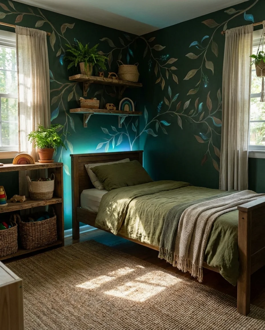 Expert-style take: the bioluminescent lighting angle in this theme serves a dual function—it creates magic during play and nighttime reading while also functioning as a gentle night light for younger children who don’t want complete darkness. LED strip lights in cool teal are inexpensive, easily installed, and controllable via remote, making them one of the smartest investments in any themed room. The mural is the larger commitment—consider peel-and-stick mural wallpaper panels if you want the look without the permanence, which is especially smart in rental homes or rooms likely to be reassigned.