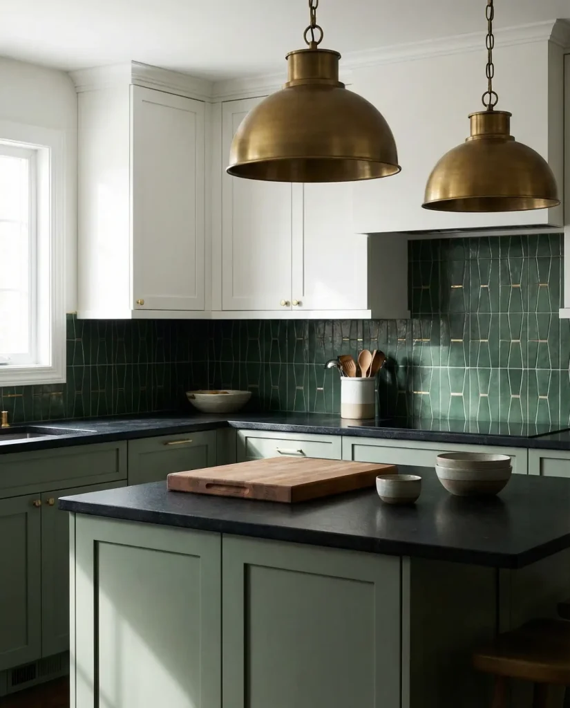 Green kitchens work beautifully in homes that get good natural light—the color shifts throughout the day in a way that makes the space feel alive. In darker kitchens, go lighter with your green choice (sage, eucalyptus, or muted olive) and pair it with warm-toned lighting to avoid the space feeling cave-like. Keeping upper cabinets lighter while going bold on the lowers and island is a tried-and-true approach that gives you drama without overwhelm.