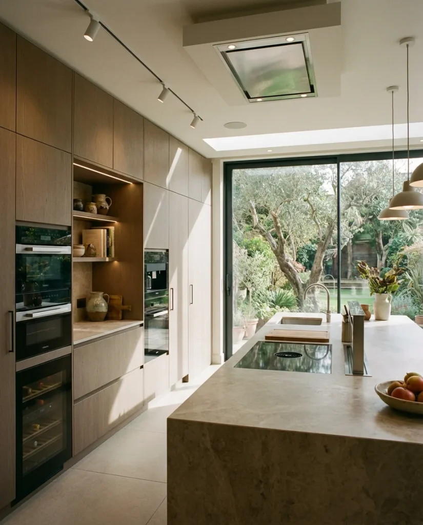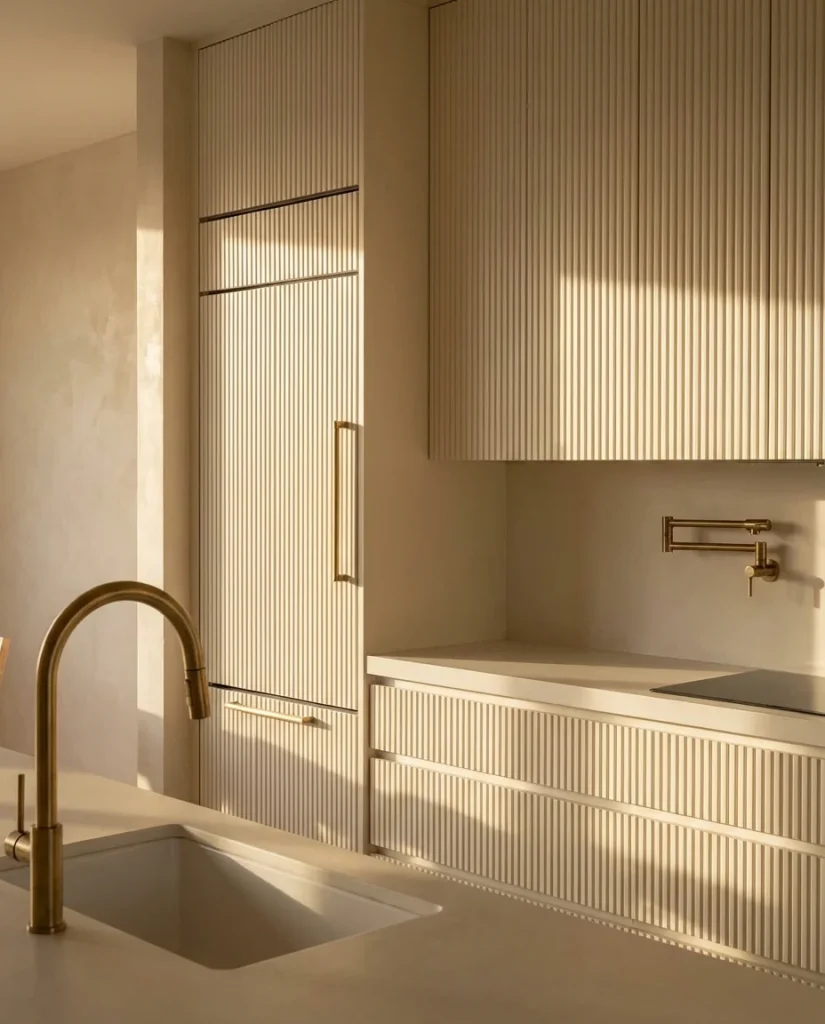 What does “design modern 2026 actually mean at a granular level? Beyond the big moves—color, layout, materials—it’s the micro-details that are shifting the feel of kitchens right now. Reeded or fluted cabinet fronts that add depth without pattern. Integrated refrigerator columns that disappear into the cabinetry run. Unlacquered brass fixtures that will patina naturally over time rather than maintaining a permanent factory shine. Plaster or limewash walls that absorb light softly instead of bouncing it back. None of these are individually revolutionary, but together they add up to a distinctly different sensibility from kitchens of even three years ago.