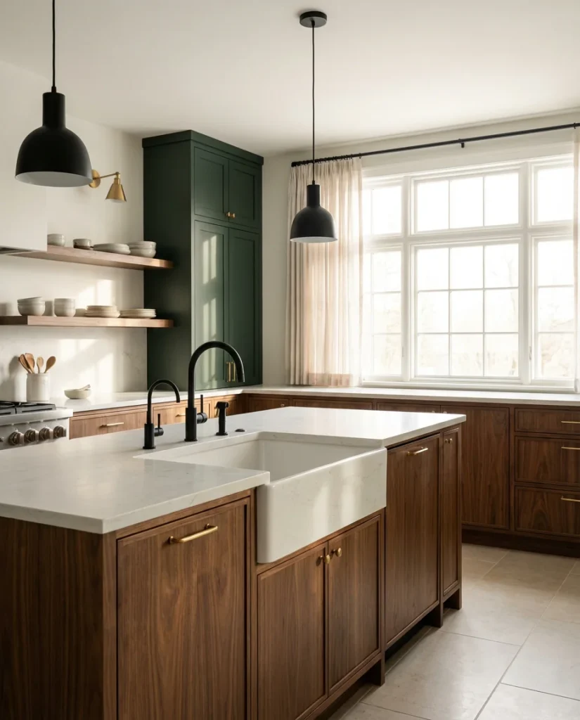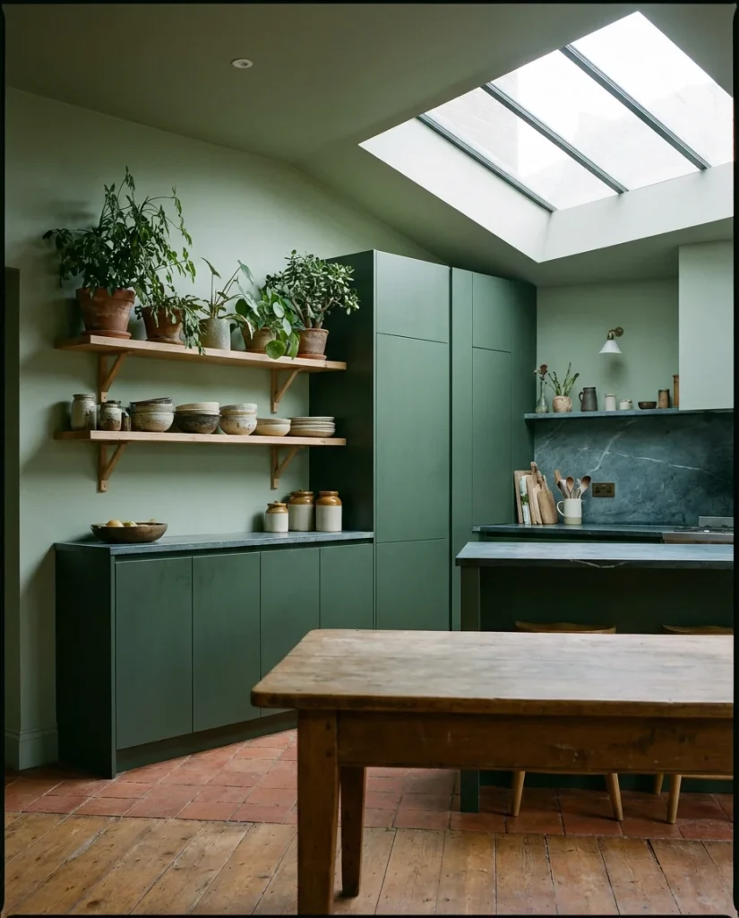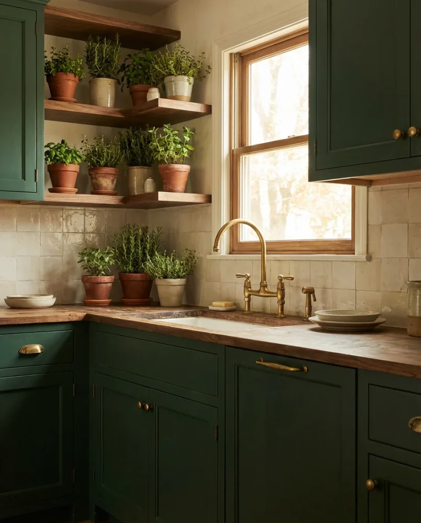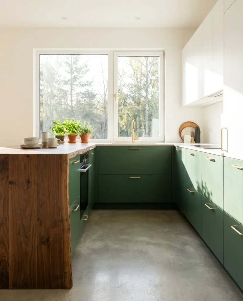 Combine green cabinetry with wooden open shelving, and you get one of the most talked-about kitchen aesthetics of the past 18 months—a look that feels simultaneously organic, modern, and deeply rooted in natural materials. The combination works because both elements reference the same source: nature. Deep sage or forest green cabinets recall forest canopy; raw-edge oak or walnut shelving recalls the trunk and branch. Together, they create a kitchen that feels connected to the outdoor world in a way that purely man-made materials simply cannot replicate.