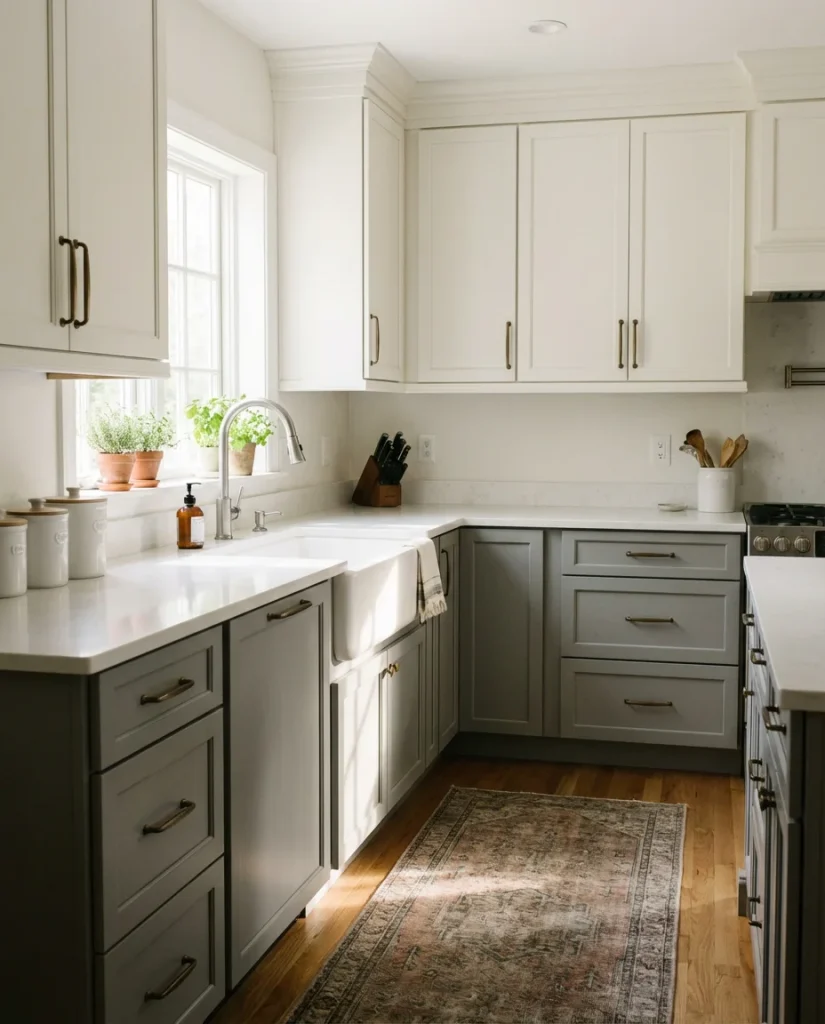 The grey and white kitchen is the little black dress of interior design—it never fully goes out of style because it works in virtually every context and age remarkably well. In 2026, the version getting the most attention pairs warm white upper cabinets with cool mid-grey lowers, grounded by a natural stone or quartz counter in a complementary tone. What lifts this classic color combination above the ordinary right now are the hardware and fixture choices: aged bronze, polished nickel in a brushed matte finish, or even hand-forged black iron all transform the same basic palette into something with a completely different character.