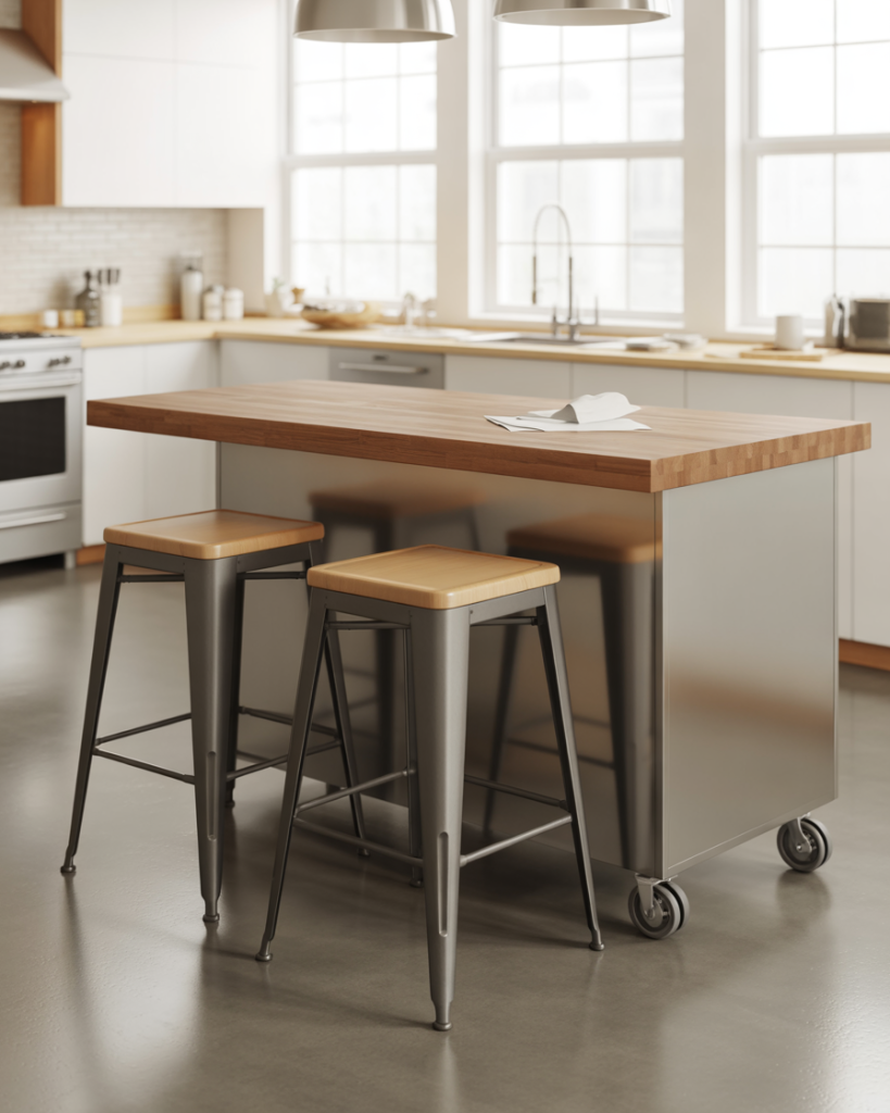 The portable butcher block island brings warmth, functionality, and movement. Made from solid wood, it’s durable enough for daily prep while remaining easy to move. It suits small-space kitchens that need flexible working zones. Many chefs prefer butcher block for its natural texture and longevity.