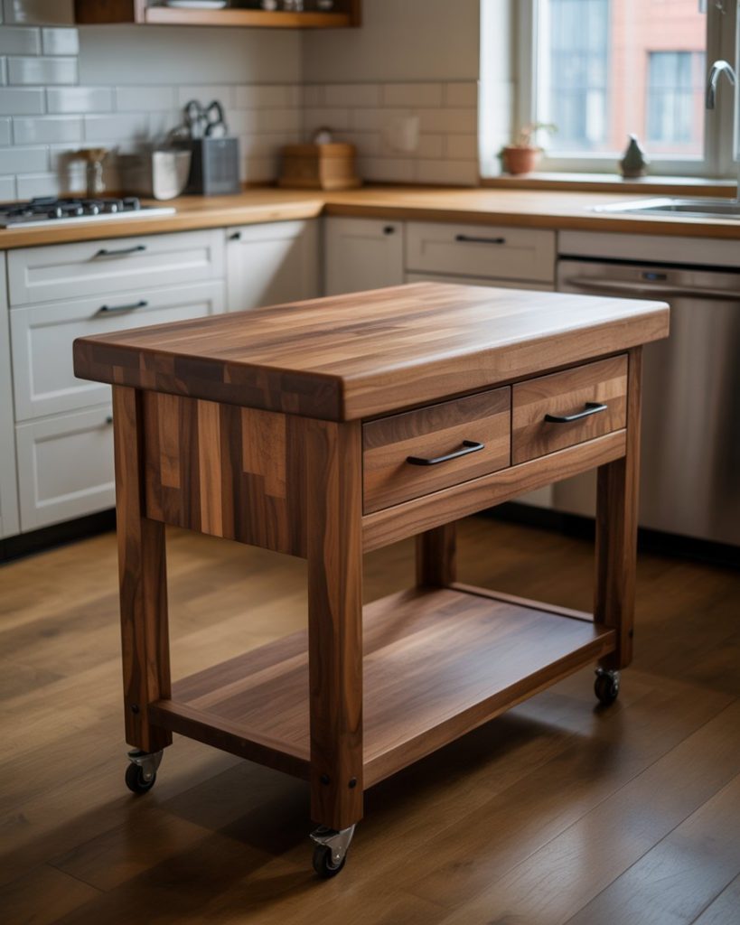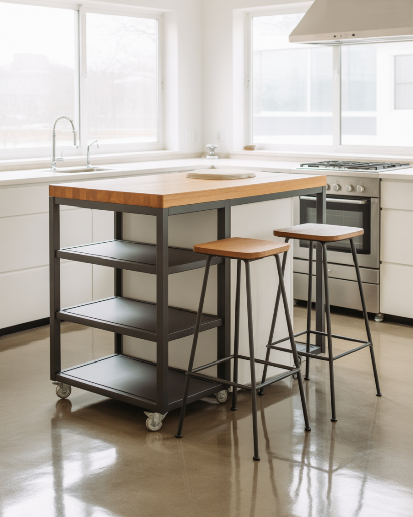 A mobile kitchen island on wheels gives homeowners freedom to rearrange their layout at any moment. Ideal for small-space apartments or open kitchens, it can function as a prep area, breakfast bar, or serving table. Pair it with bar stools and a white oak top for a warm yet flexible setup that moves with your lifestyle—just as design expert Emily Henderson recommends for adaptable living.
