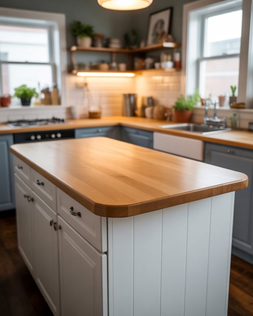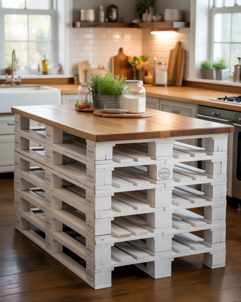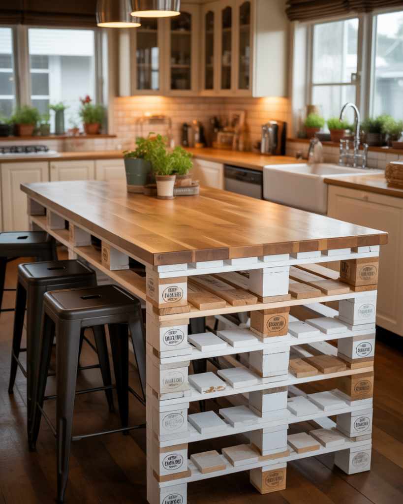 For budget-friendly creativity, an easy DIY pallet island is a weekend project that looks designer-made. Using repurposed wood pallets, paint it white or black, and top it with a white oak slab for contrast. DIY bloggers like The Merrythought showcase countless variations that fit both modern and farmhouse styles.