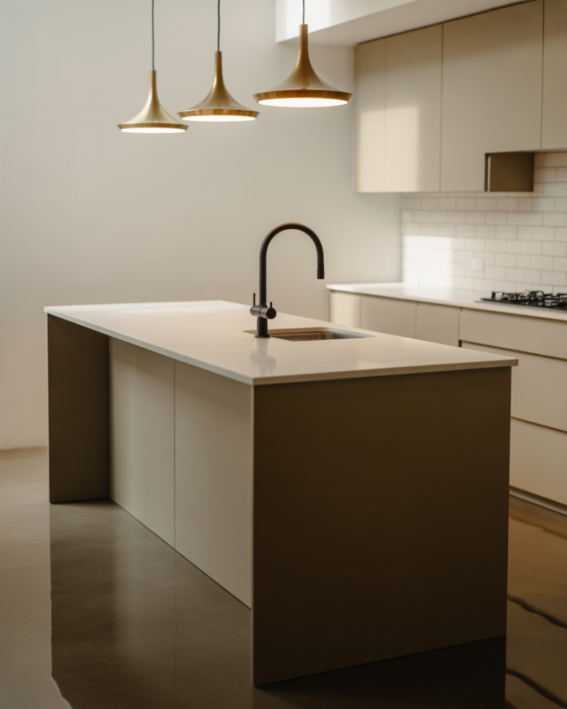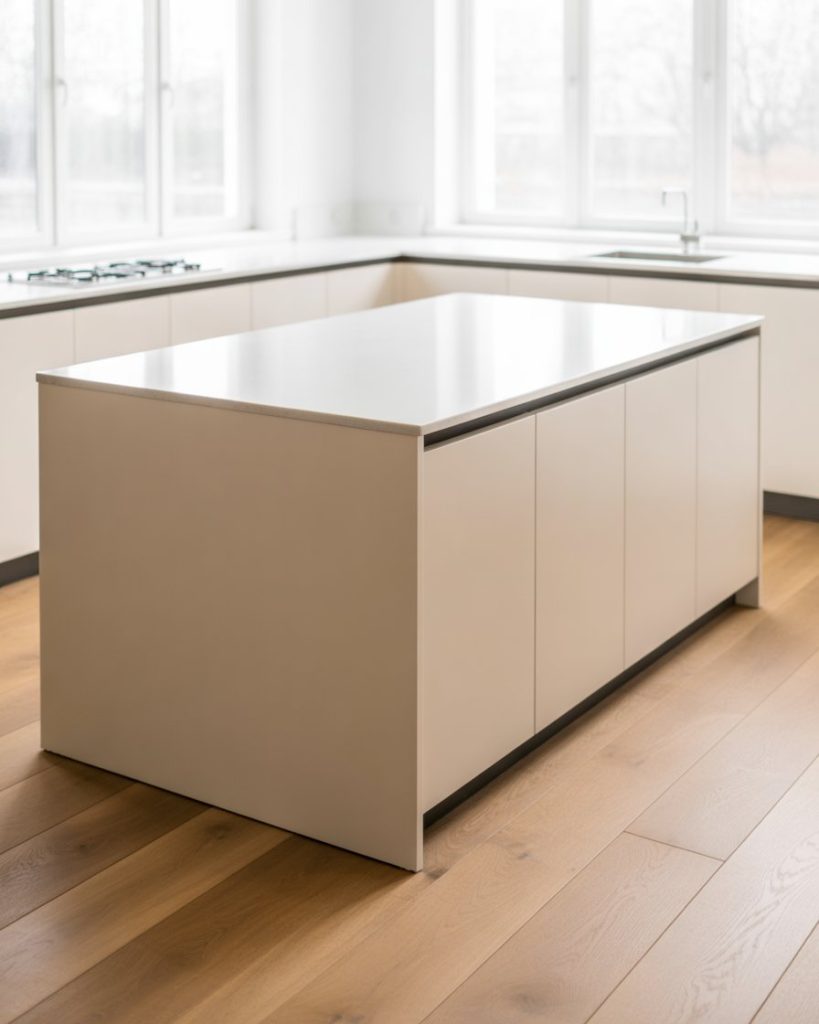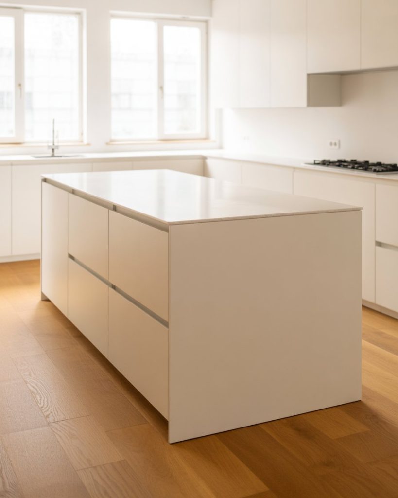 A white minimalist island never goes out of style. Its clean lines and simplicity make it ideal for both small-space apartments and expansive open kitchens. Use matte finishes and hidden handles for a seamless look. Influencers like Kelly Wearstler recommend pairing white oak floors with white cabinetry for a calm, airy aesthetic.