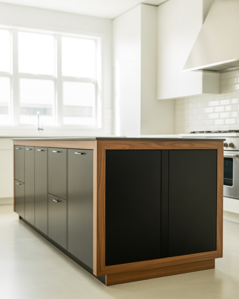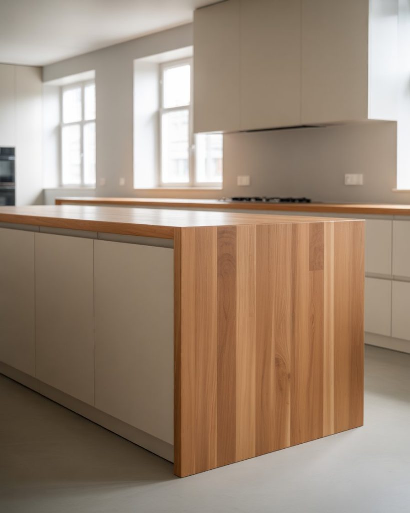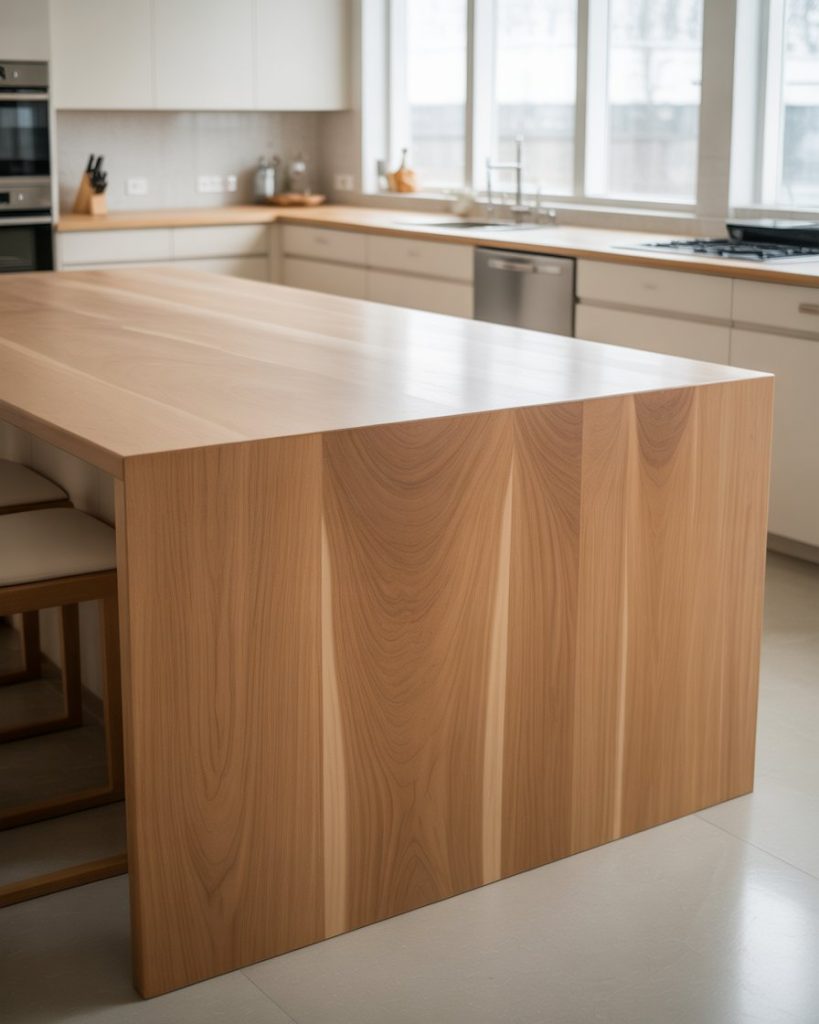 The wood waterfall edge island is a stunning piece with the countertop material cascading down the sides and is especially striking in white oak or black walnut. It adds organic elegance to any space.