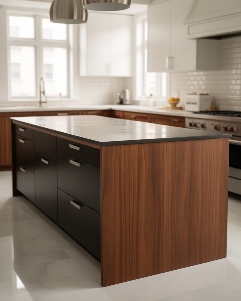 A black island instantly adds sophistication and depth to your kitchen. Contrasted against white walls or wood accents, it creates a bold focal point. It works beautifully in large spaces and modern lofts. Architectural Digest calls black islands the “new neutral” of 2026.