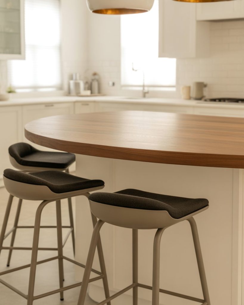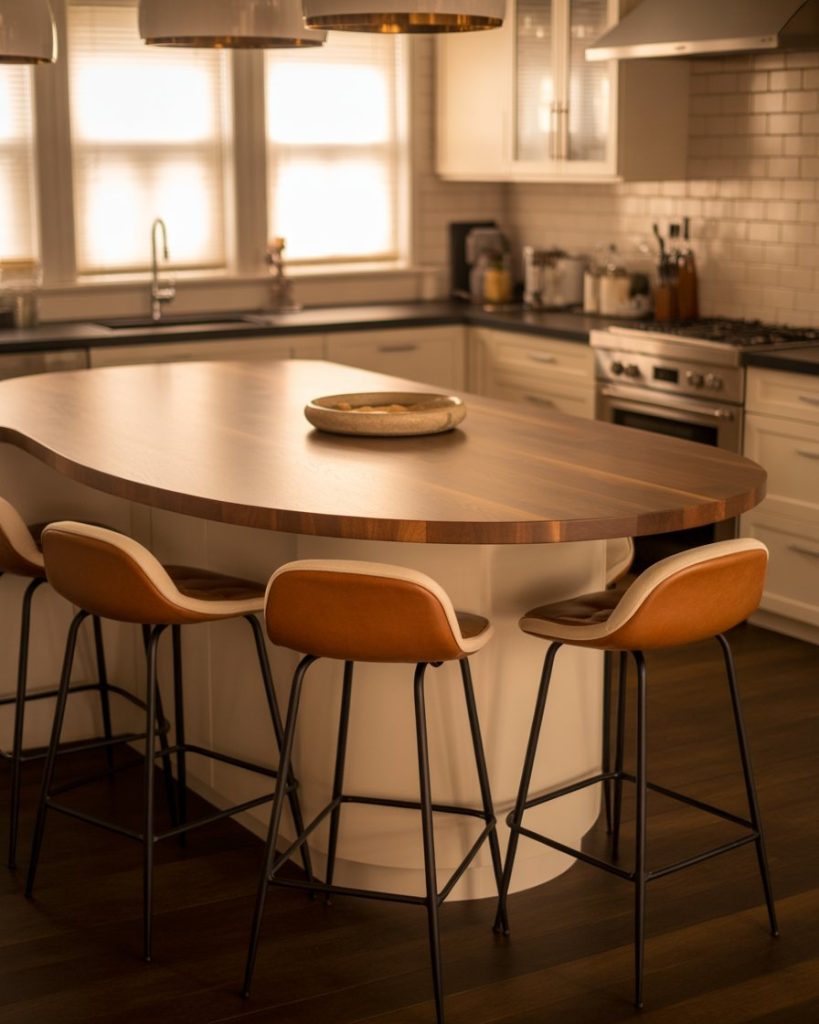 A round island creates an intimate dining and prep area that encourages connection. Ideal for tiny or narrow kitchens, it softens the flow and makes movement effortless. Use bar stools around the curve for social dining. Interior designer Nate Berkus praises circular shapes for their friendly, conversational appeal.