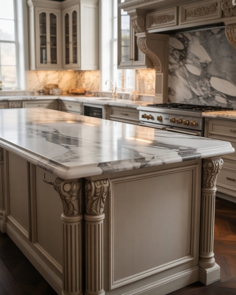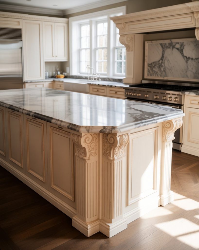 Adding columns to your island design makes an architectural feature. They can frame seating, divide the prep areas, or structurally connect beams in lofty spans. Column bases or shafts in white marble or wood add a touch of elegance. They contrast with the functional and flexible modern home design. Classical interiors inspired reimagined modern homes.