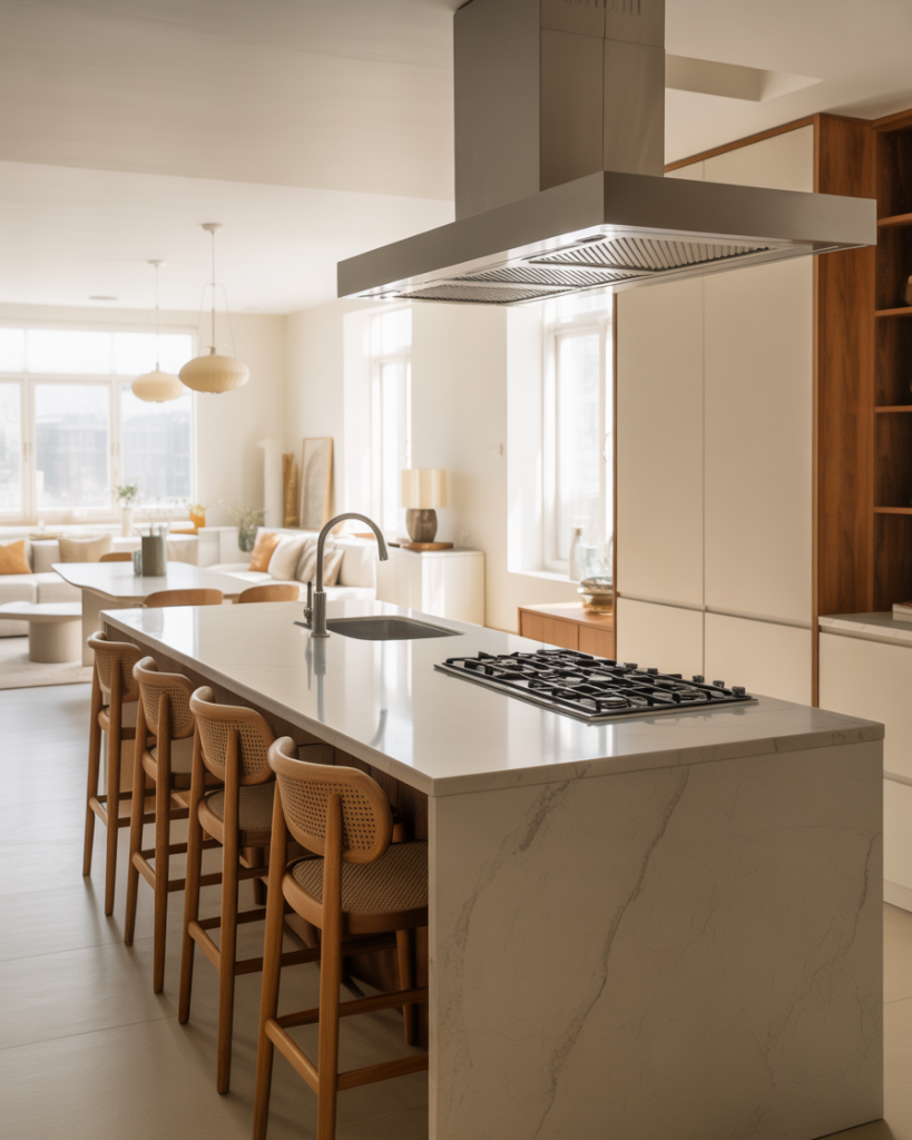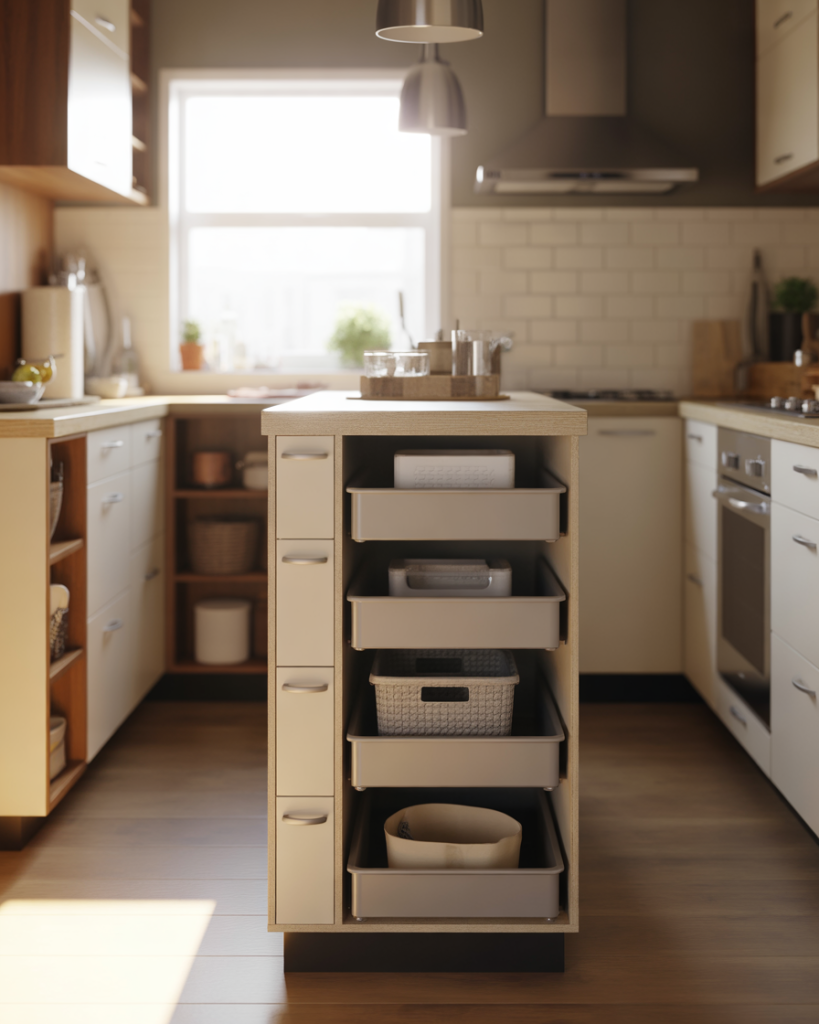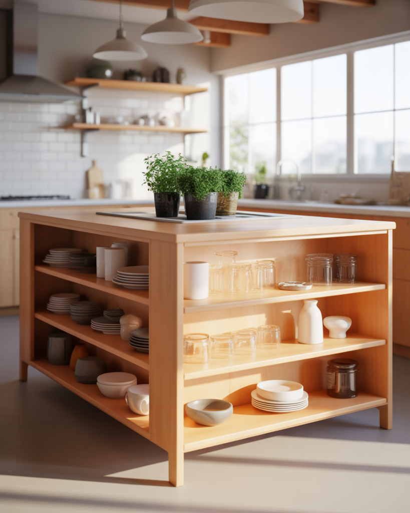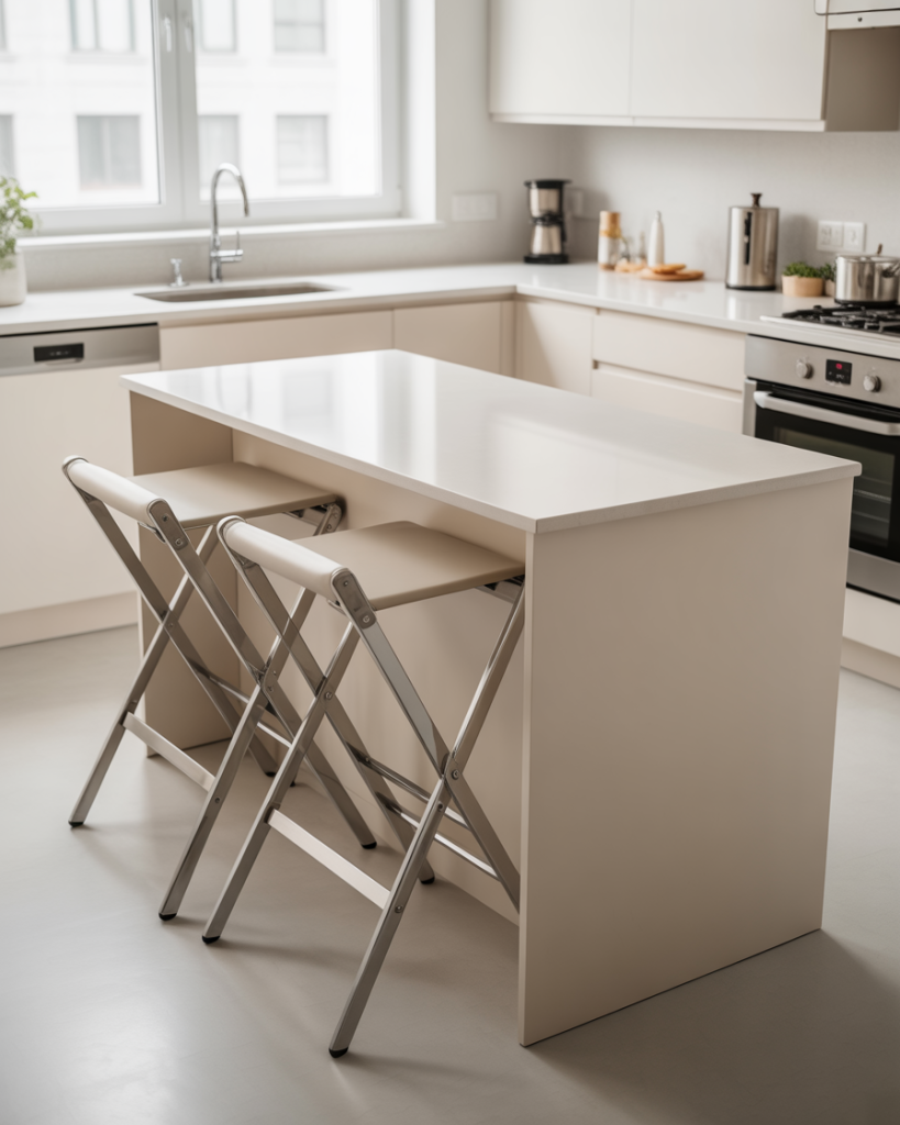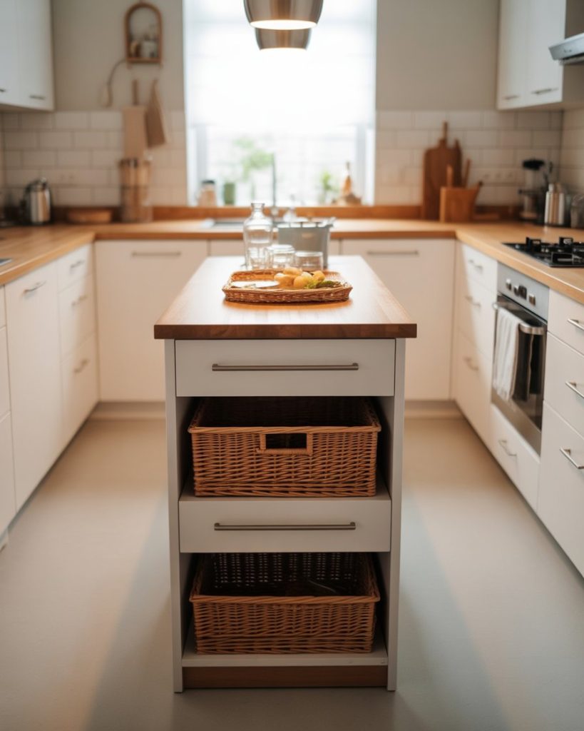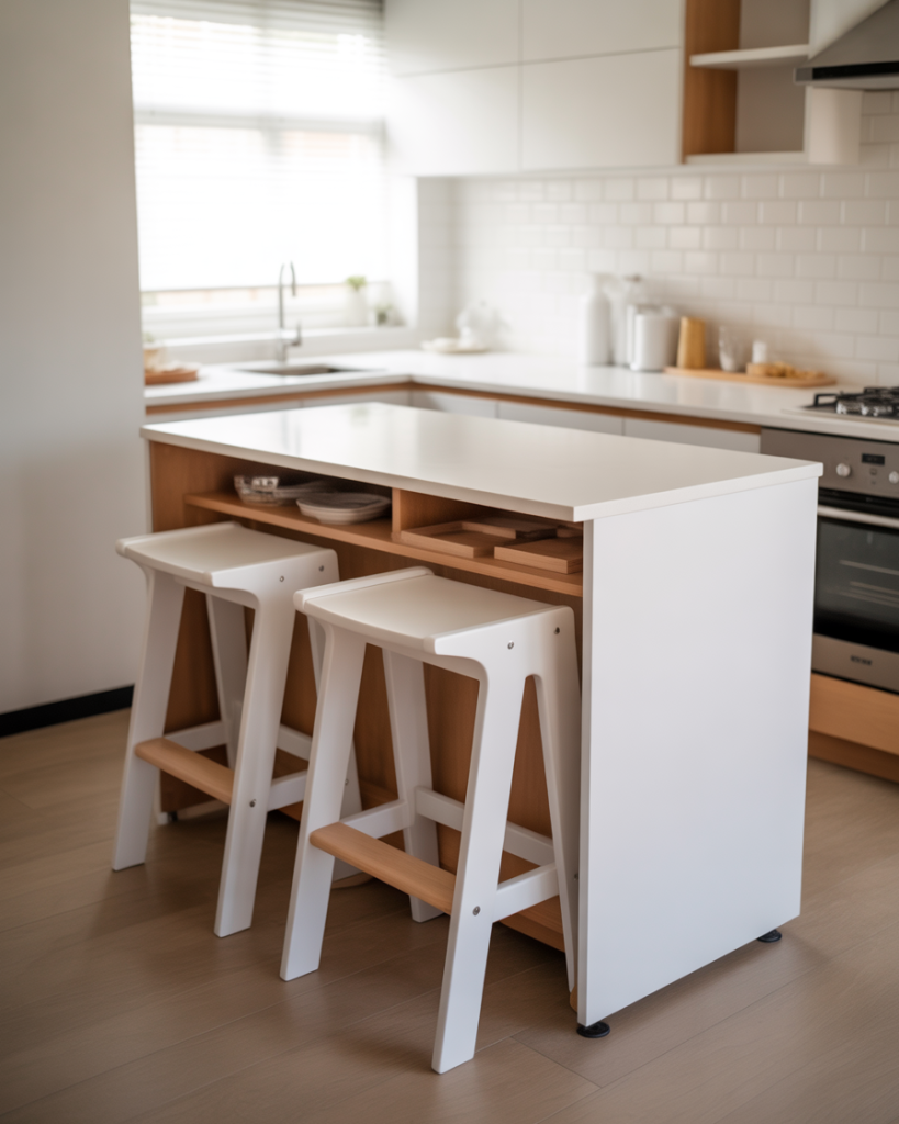Creativity is the key in a tiny apartment. A slim island with built-in storage and foldable seating makes even the smallest space a functional hub. Light finishes and reflective surfaces can visually enlarge the area. Such adaptable micro-islands are championed by IKEA and small-space influencers.