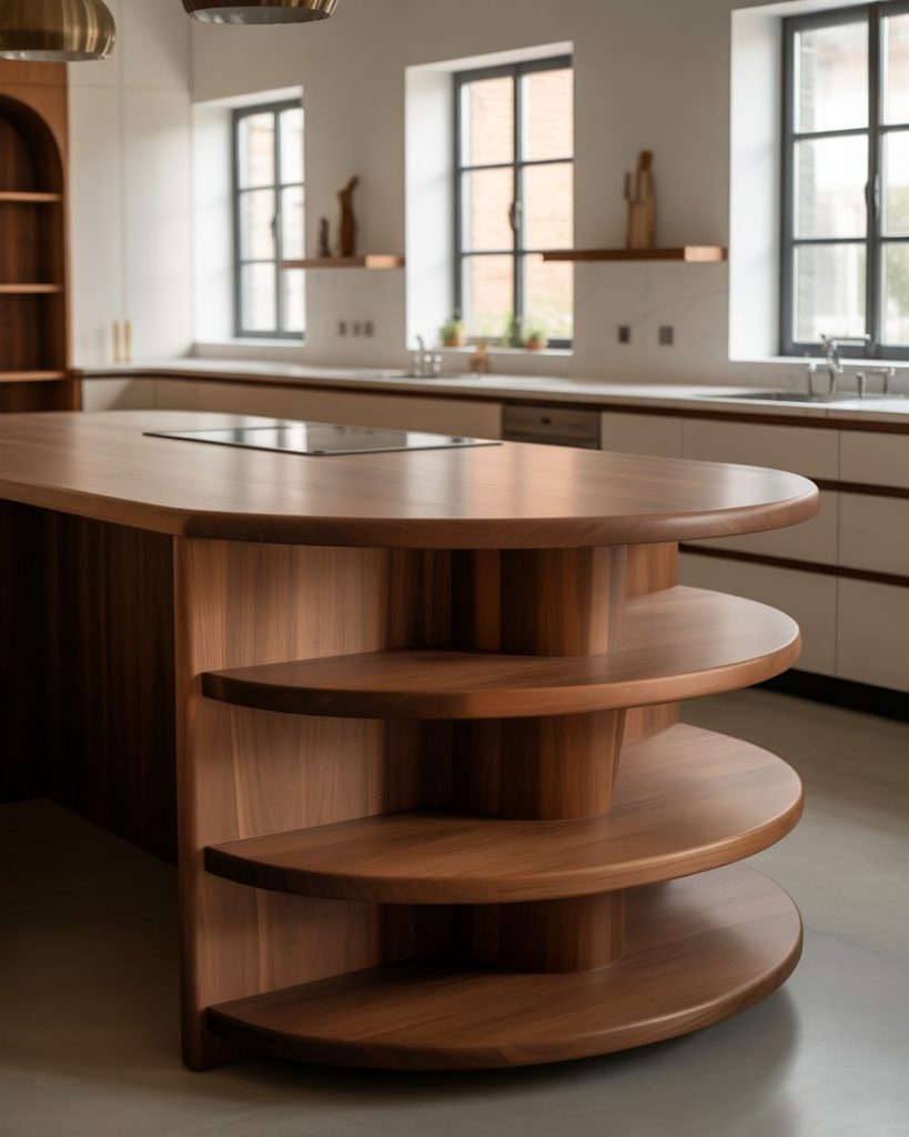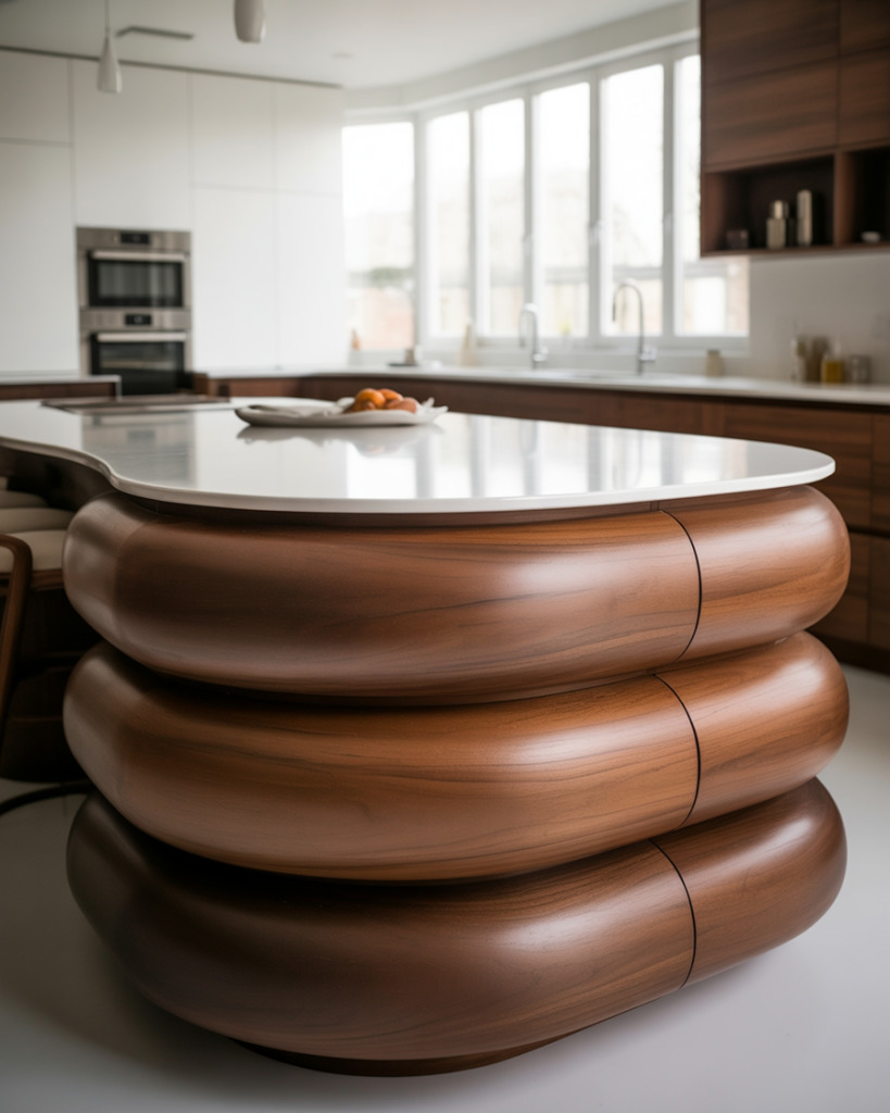 The curved island is an emerging trend set to dominate 2026, as it provides a softer and more organic aesthetic and appeal. Movement and comfort are enhanced, and seating areas are more relaxed to use. Curved islands in black marble or pale wood add to the sculptural and unique styles as they are artwork with function and design. [ID8]