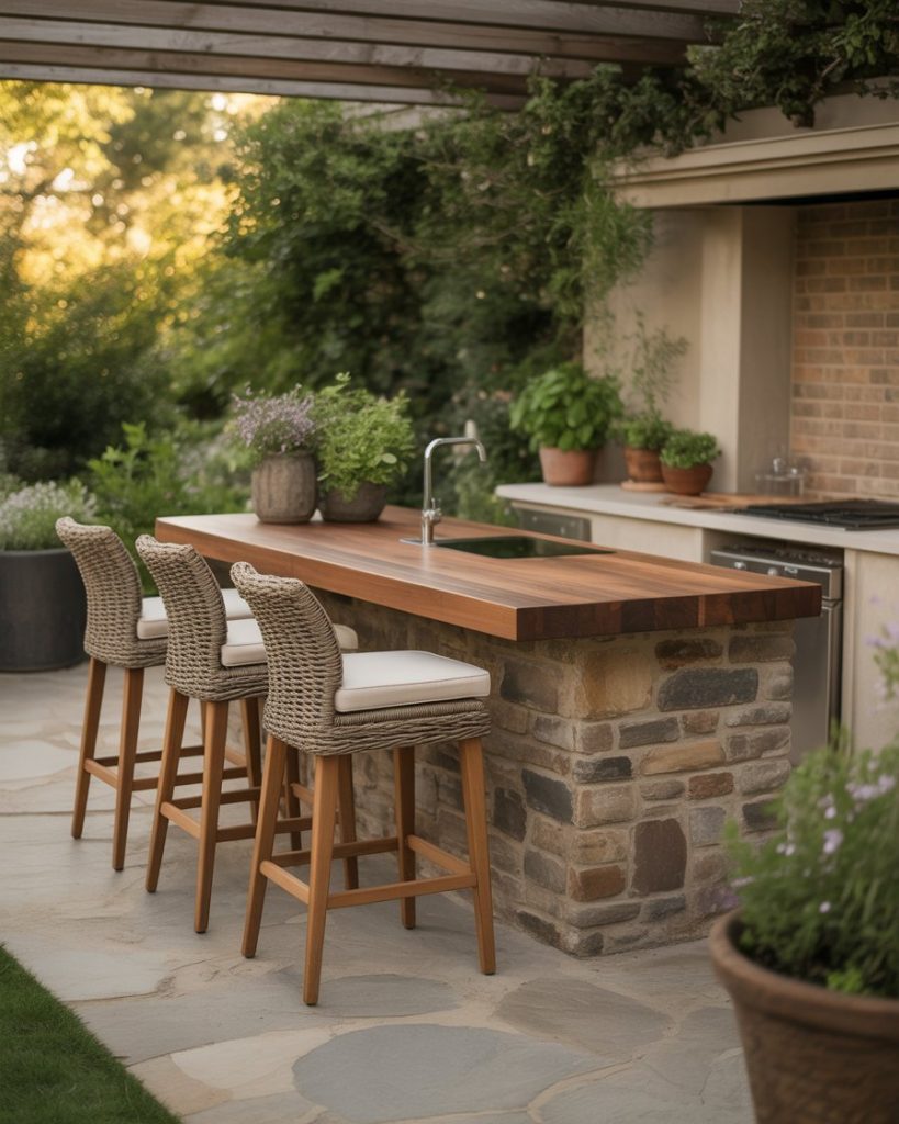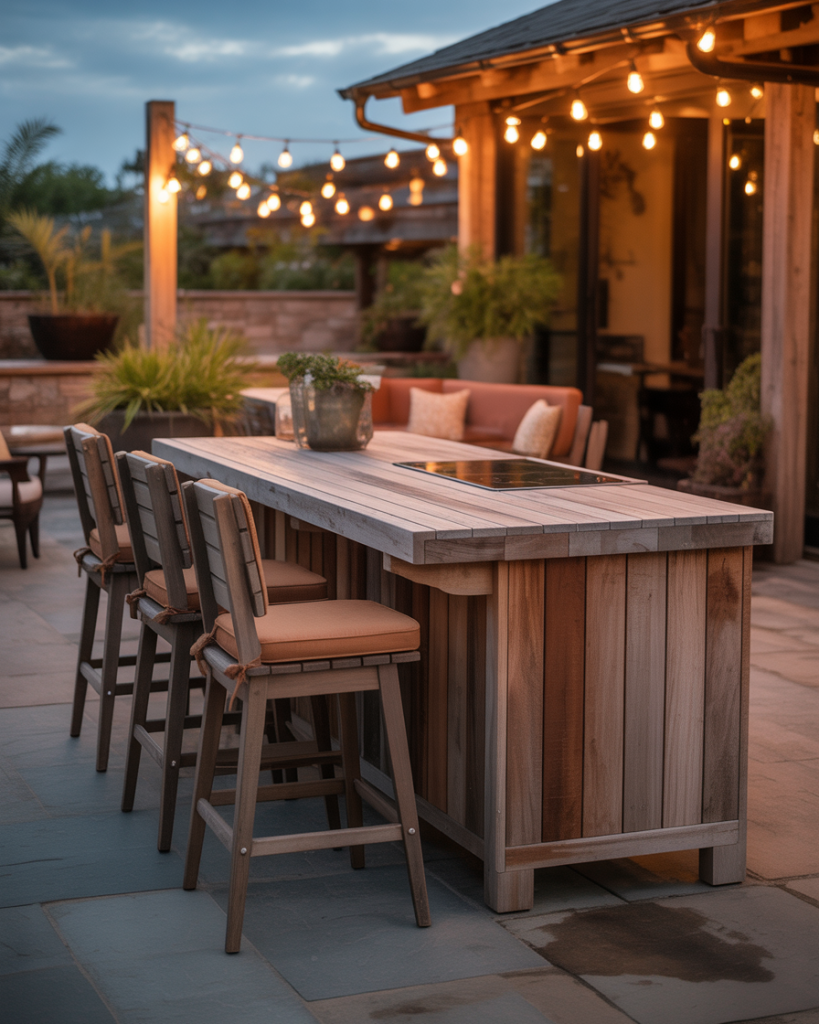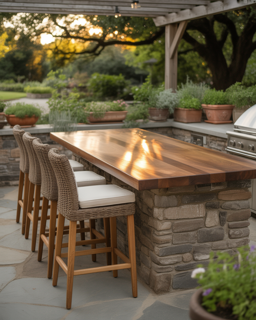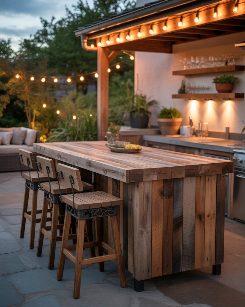 An outdoor bar-style island boosts lazy entertaining in the backyard. It’s created with weatherproof wood or stone. It’s an island for cocktails, grilling, and laughter. Add bar stools and string lights for ambiance. Garden designer Paul Bangay often includes outdoor islands as the centerpiece for alfresco living.