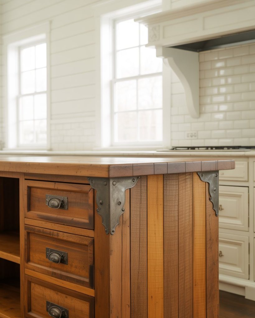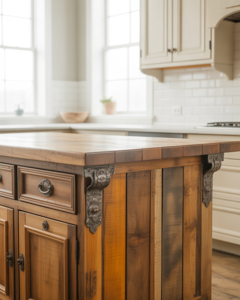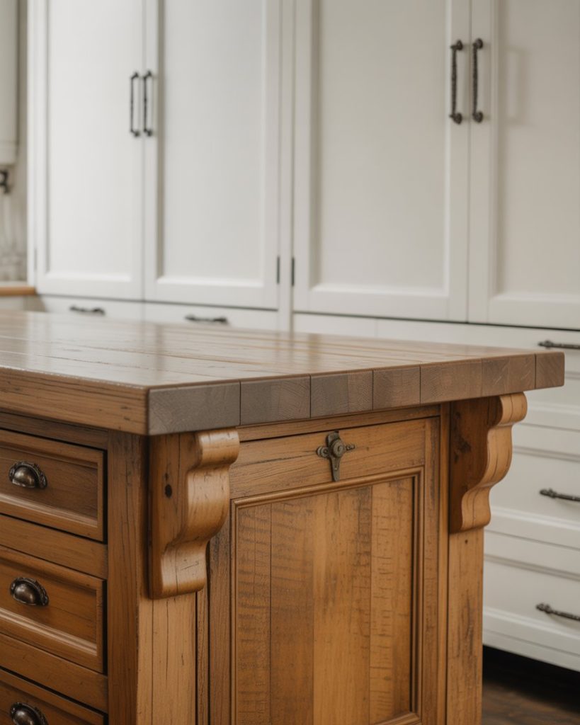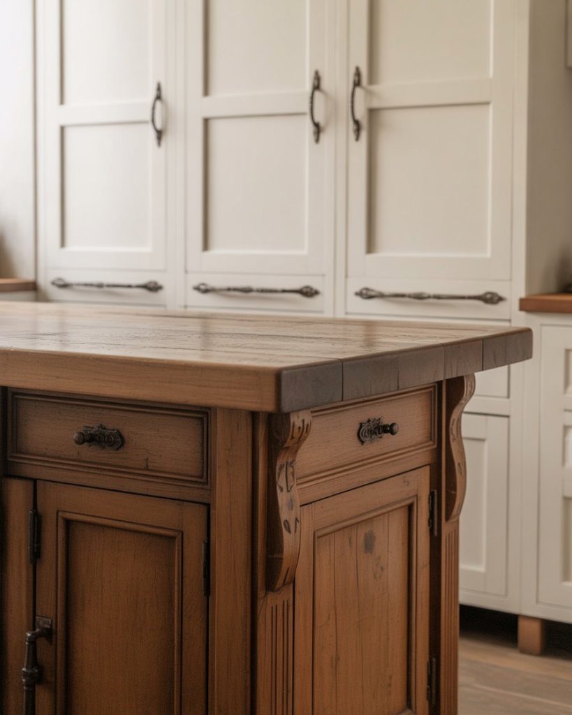 An antique island instantly adds soul and history to your space. Repurposed tables or vintage workbenches make charming alternatives to modern units. They pair beautifully with white cabinetry or black fixtures. Designer Jean Stoffer says that aged wood tells a story, making the kitchen feel both curated and timeless.
