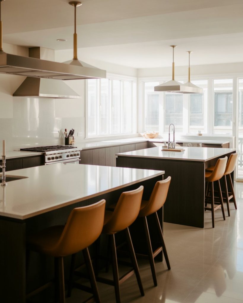 In large kitchens where the activity of cooking and entertaining mingle, a double island layout is the epitome of luxury. One island can hold the stove or sink, while the other offers seating for guests. It adds the practicality of the symmetry of a 3D puzzle while boosting symmetry. This is seen in family homes designed by Architectural Digest’s designers. This layout is for families that love to host and cook together.