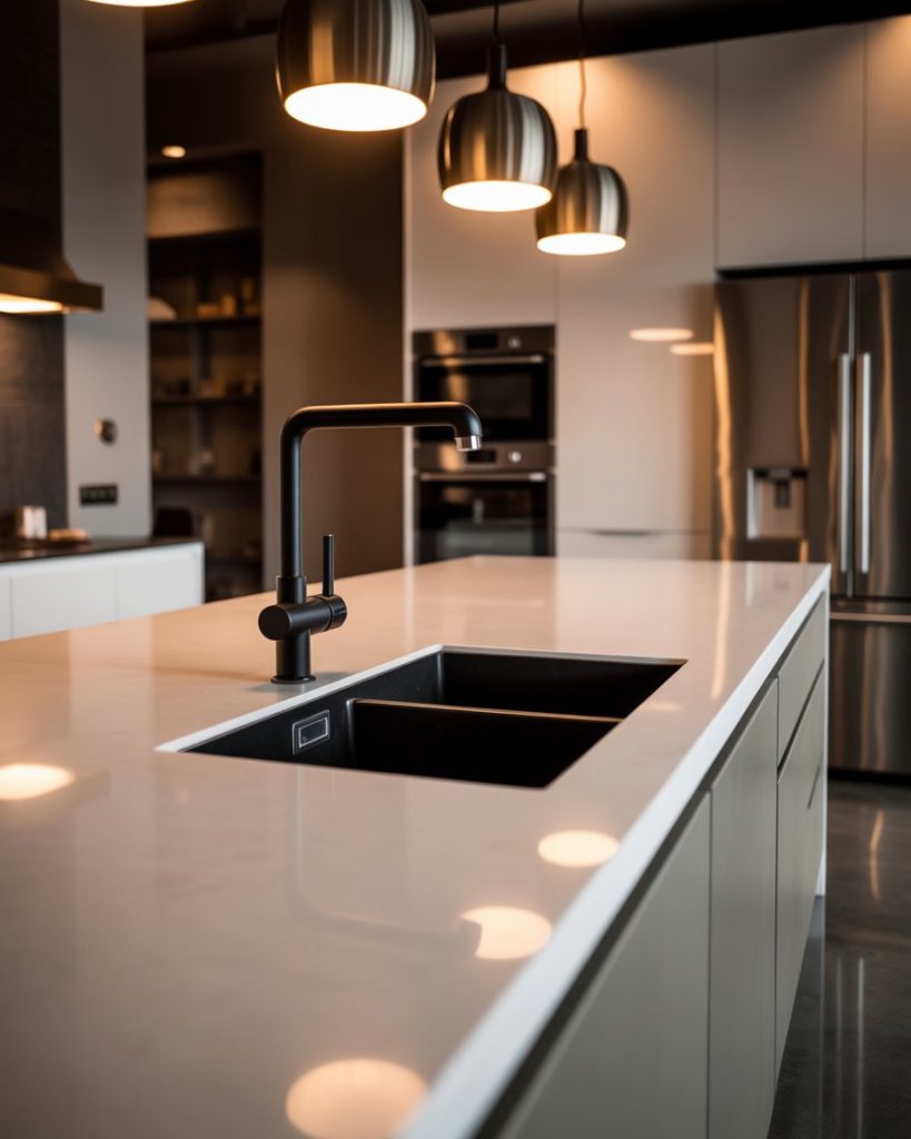 Placing a sink in your island maximizes efficiency, making cleanup convenient and workflow seamless. It’s perfect for narrow kitchens or layouts with limited wall space. Add columns or pendant lights above to define the zone. Designers on Houzz recommend pairing a white countertop with a black faucet for timeless contrast.