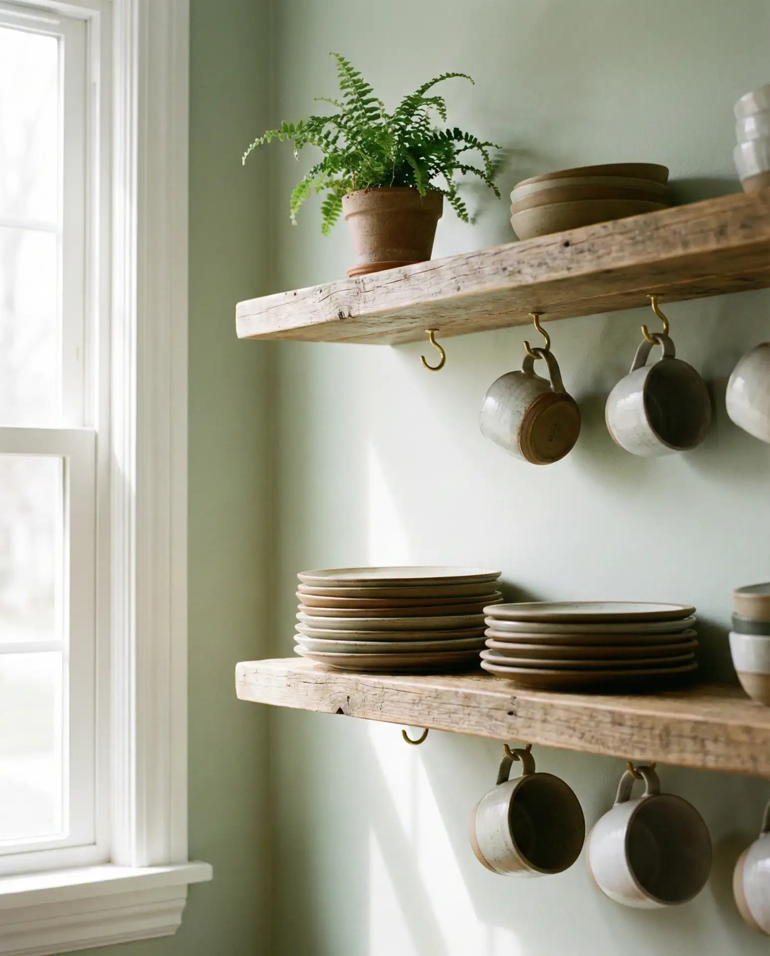 Interior louvered shutters painted in a soft white or cream finish bring a French country sensibility that feels collected and lived-in rather than overly coordinated. They’re ideal for cottage kitchens where you want to control light without blocking it entirely. The adjustable slats let you angle sun away from screens or direct it onto plants, and the solid construction stands up to humidity better than fabric treatments near sinks or dishwashers.