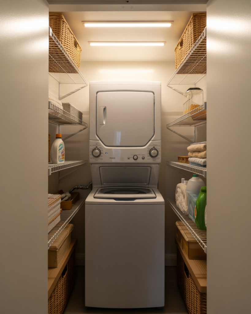 Turning a closet into a laundry area is one of the smartest 2026 upgrades for tiny homes or apartments. A small space stackable unit saves precious square footage, while retractable shelves and slim baskets keep everything tidy. Add LED lighting, folding doors, and a pull-down ironing board to complete the setup. This hidden laundry zone is the ultimate in convenience and efficiency.