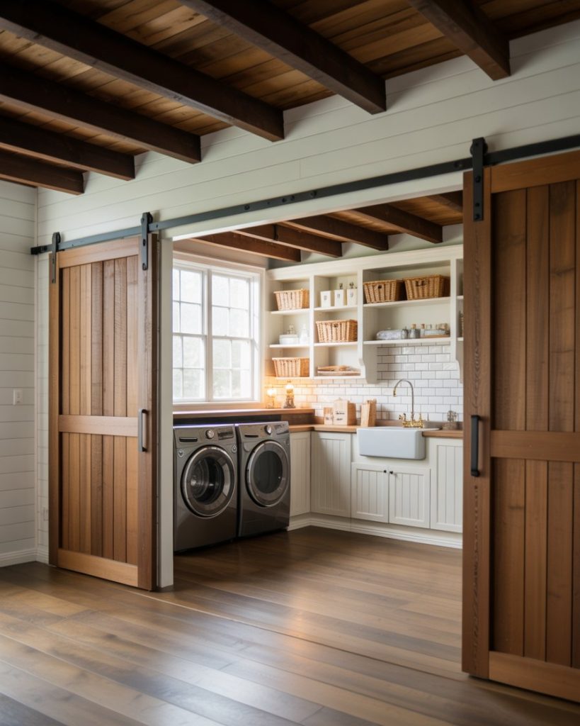 A large barn-inspired laundry space brings personality and practicality together. Exposed beams, sliding barn doors, and a generous top-loader layout make it ideal for family homes. Add built-in cabinetry for organization, plus space for crafting or pet care. Designers at Southern Living suggest such multifunctional rooms will define next-generation farmhouse design.