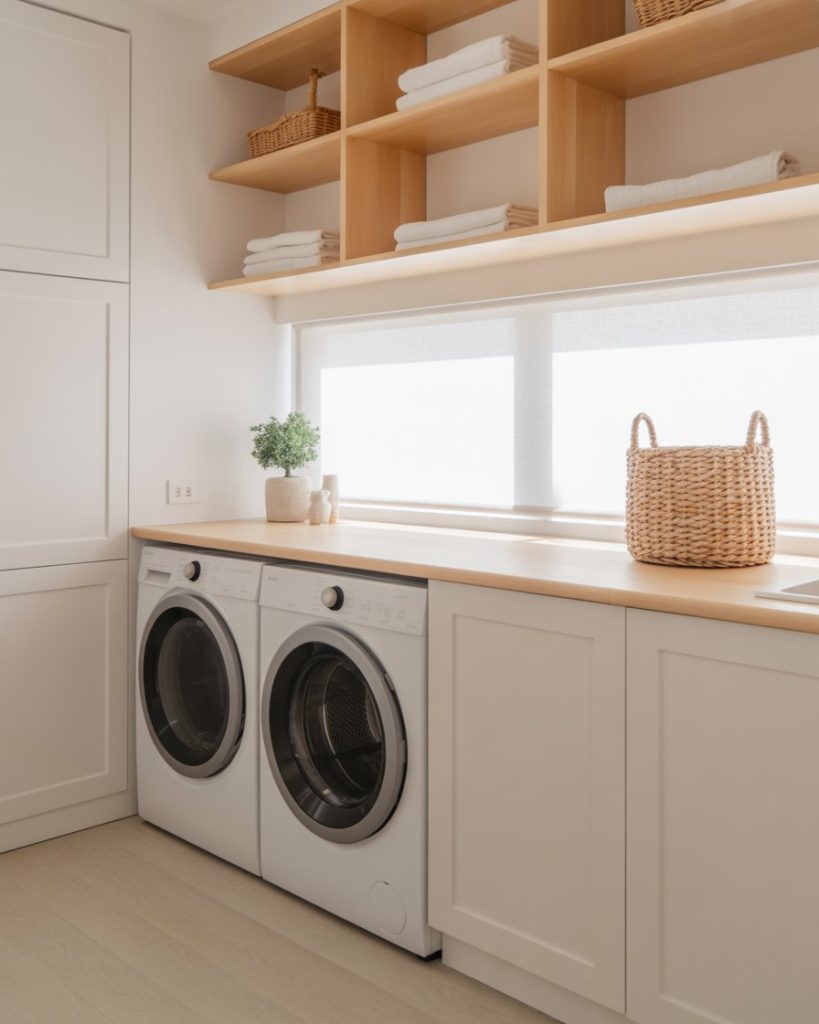 Inspired by Nordic design, a small-space laundry room can embrace clean lines, light wood tones, and soft whites. Use minimalist cabinetry, woven baskets, and a simple front loader to keep things serene. Natural light and greenery add warmth without clutter. The Scandinavian approach prioritizes calmness, order, and timeless beauty.